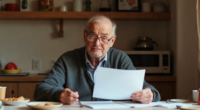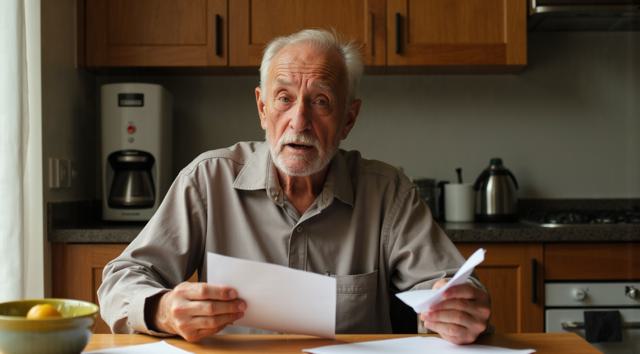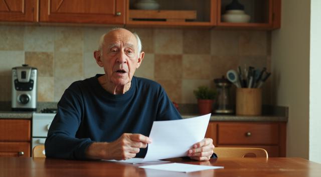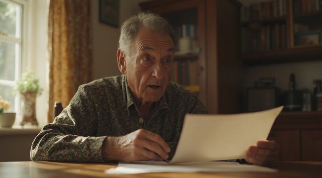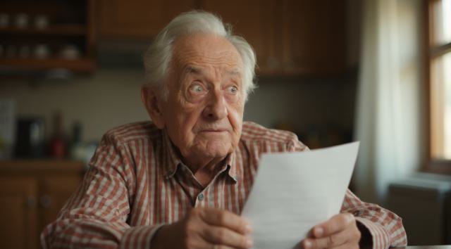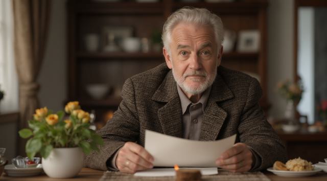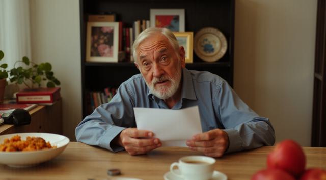 Дедушка сидит за столом на кухне. В рука держит лист бумаги. Лицо дедушки удивленное