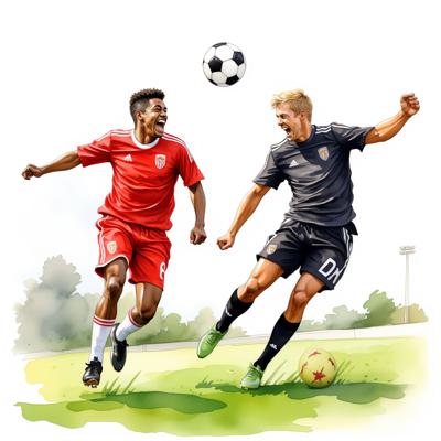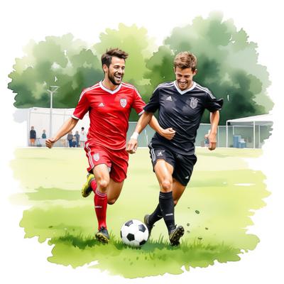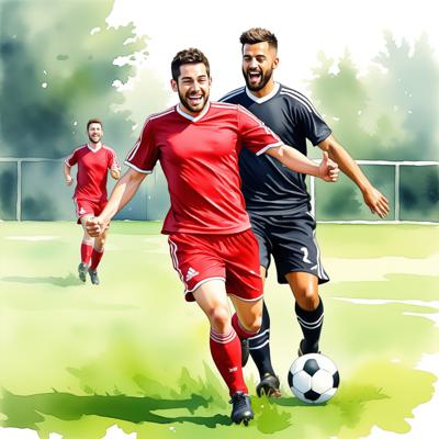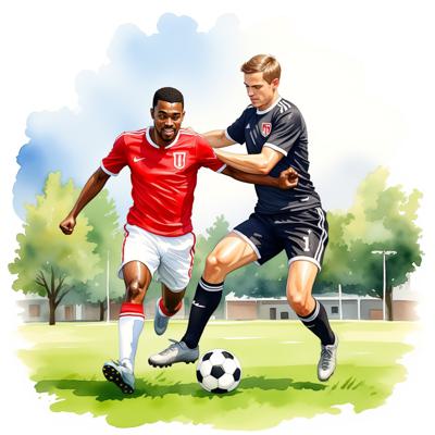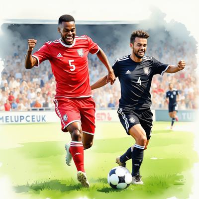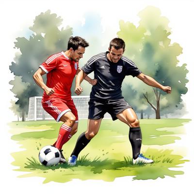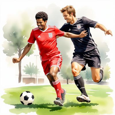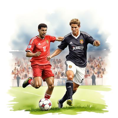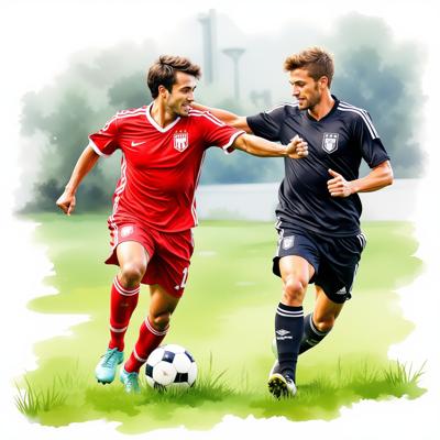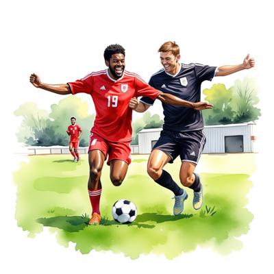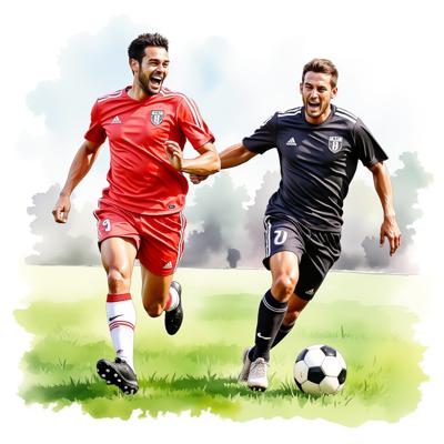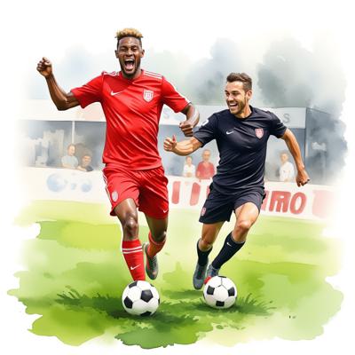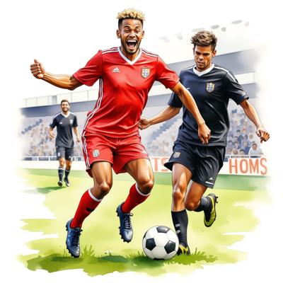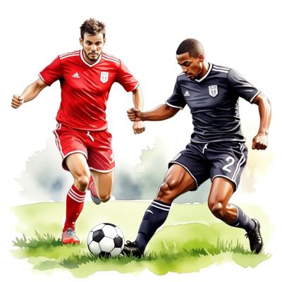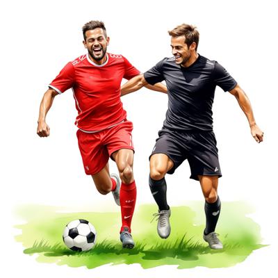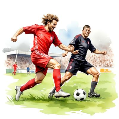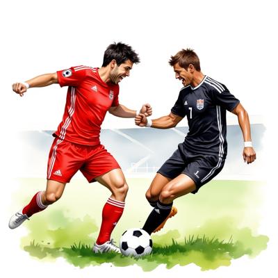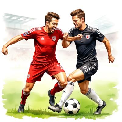 Игрок футболист в красных шортах и красной футболке празднует победу, а соперник игрок в черных шортах и черной футболе футболке в жестком стыке за мяч на газоне.