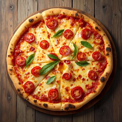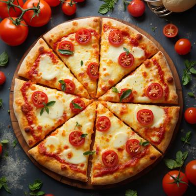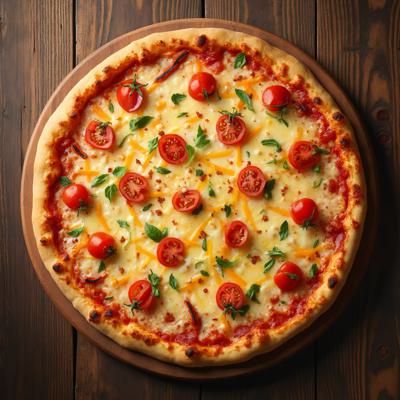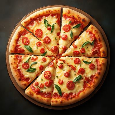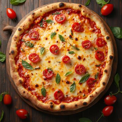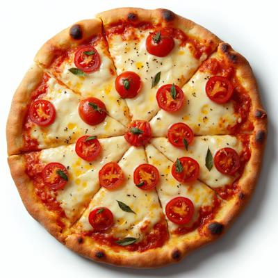 максимально реалистичная круглая пицца с сыром и маленькими помидорами , вид сверху
