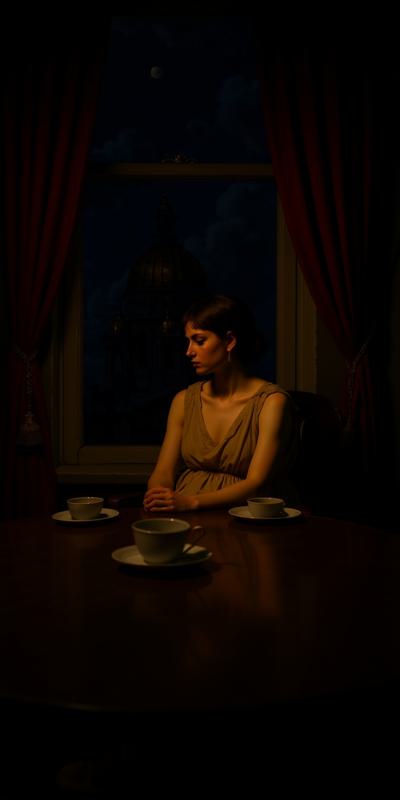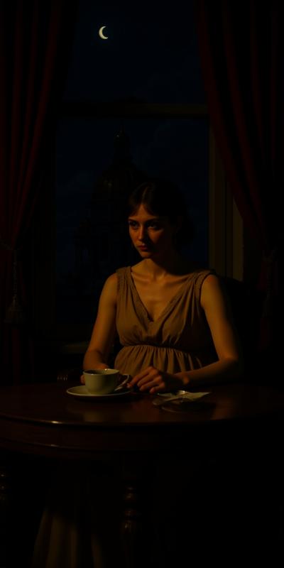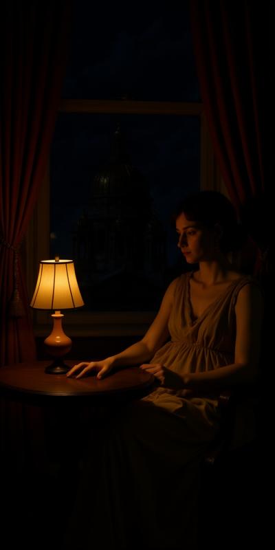 Сделай ночь,добавь больше интерьера,она сидит за столом,освещна теплым светом в комнате [Уточнение для #5977068 'Девушка сидит у окна. За окном лунная,светлая ночь и луна,за окном Исаакиевский собор. Красивый интерьер. Девушка освещена мягким,теплым светом ]'