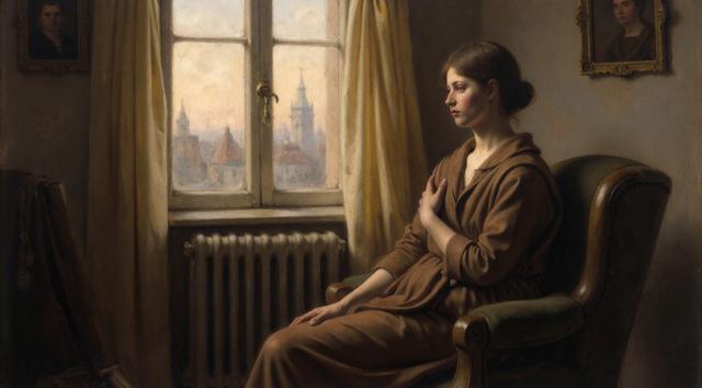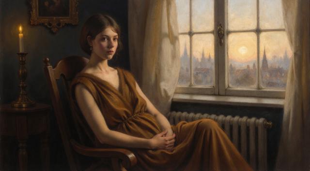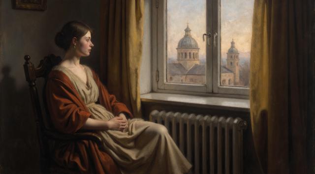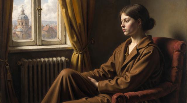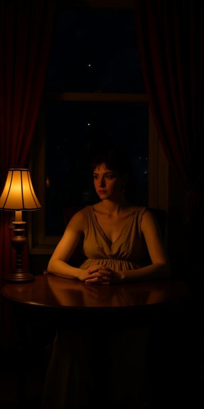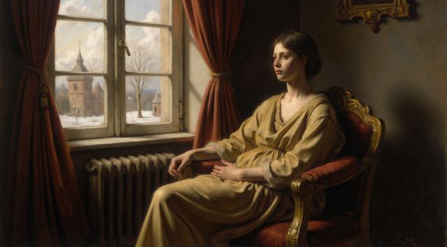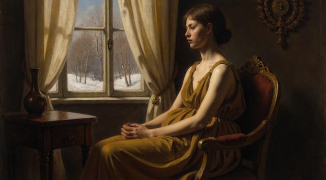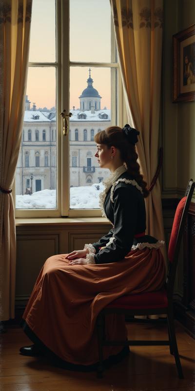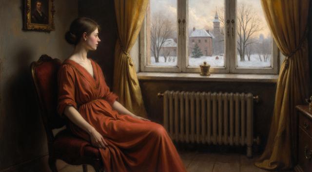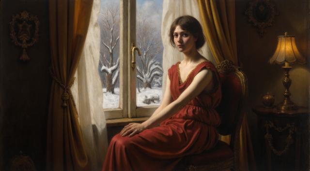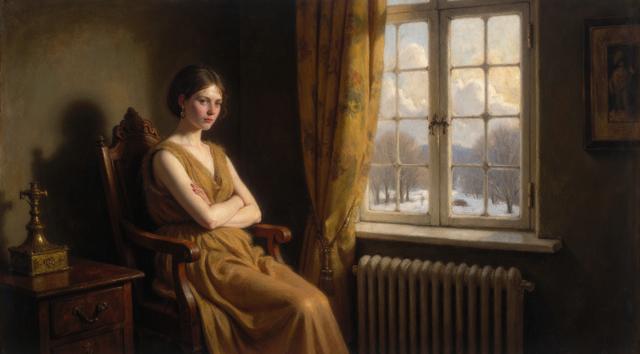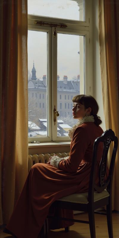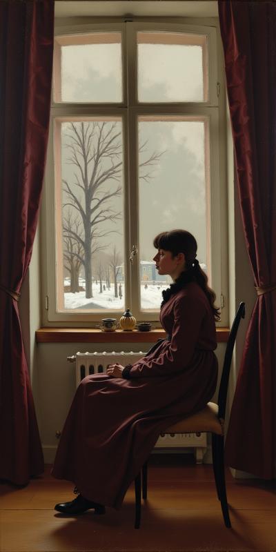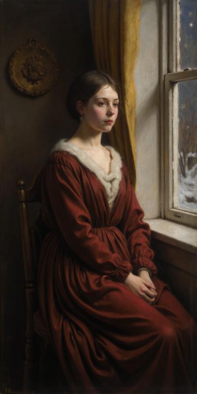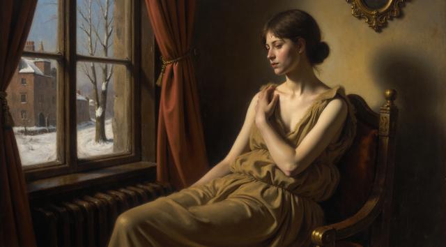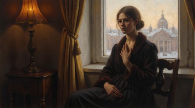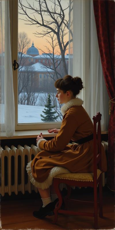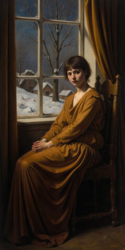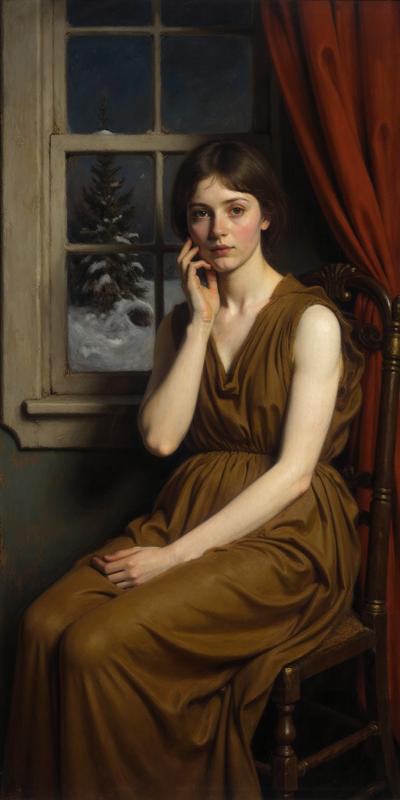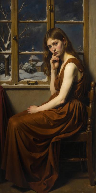 Создай портрет задумчивой девушки сидящей на стуле, одетой в домашнюю одежду,на ней должно быть теплое платье. Она должна сидеть в освещенном,теплом интерьере. Сделай упор на контрастное освещение. За окном ночной,холодный,зимний пейзаж Санкт-Петербурга. Сделай изображение максимально приближенным к картине