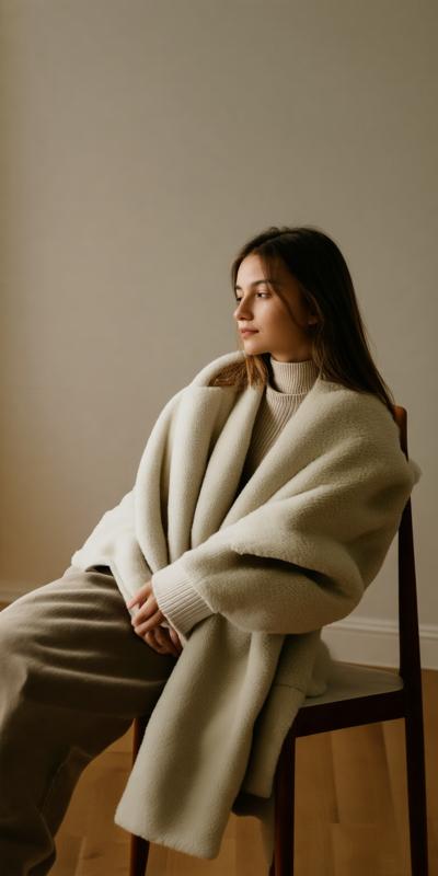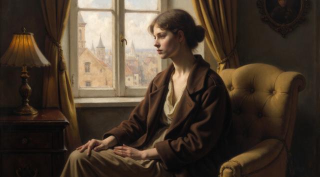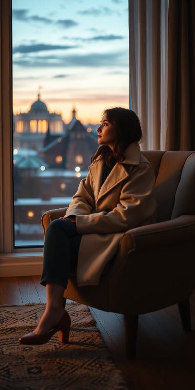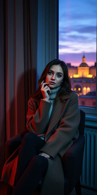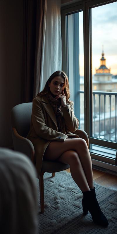 Создай портрет задумчивой девушки сидящей на стуле, одетой в современную,домашнюю одежду,на ней должно быть пальто в освещенном,холодном интерьере,в одинокой квартире,а за окном вечерний,теплый пейзаж,Санкт-Петербург. Сделай изображение максимально приближенным к картине