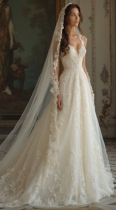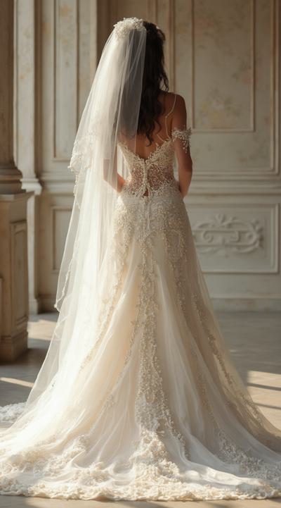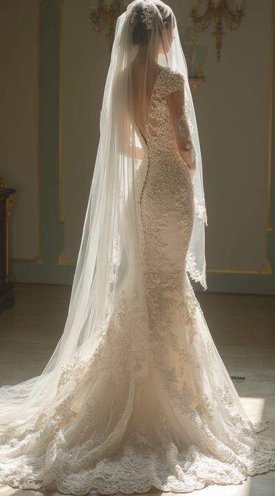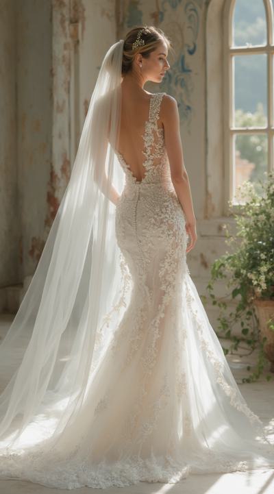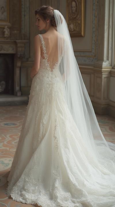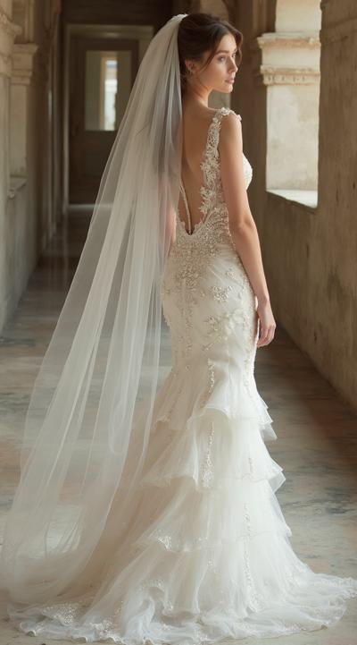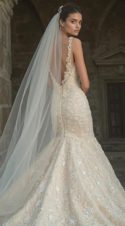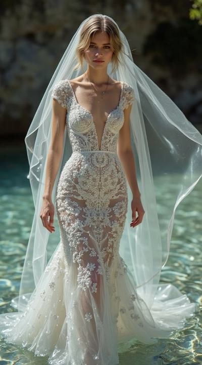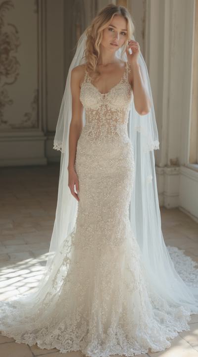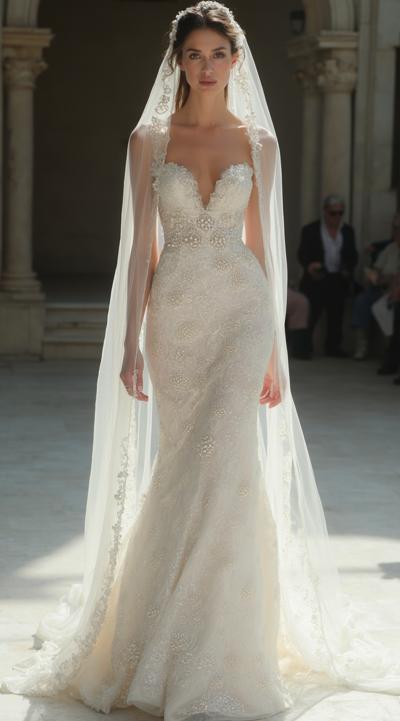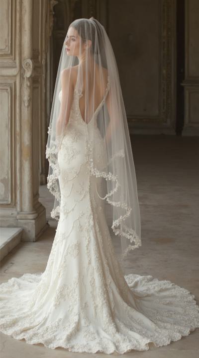 элегантное платье с жемчужными нитями пришитыми волнами по всей длине, фата из кружева,