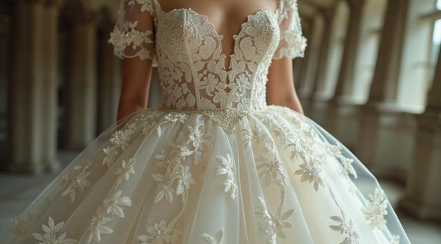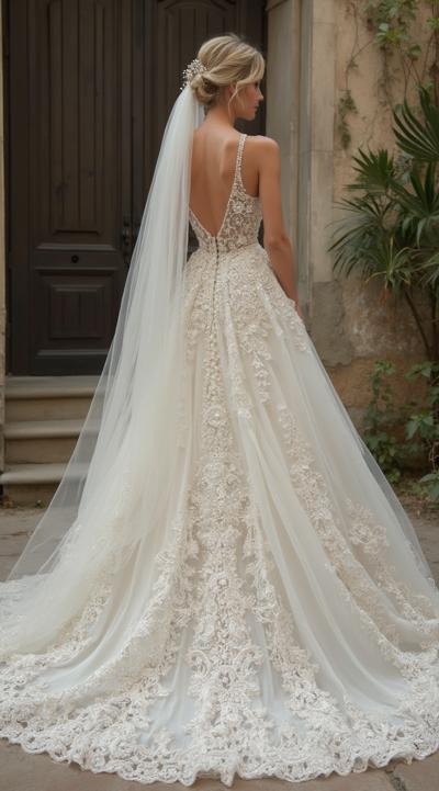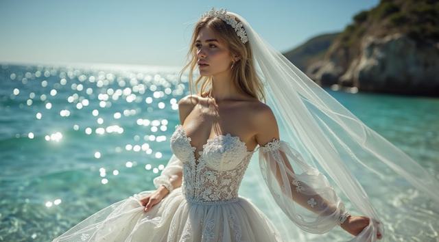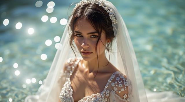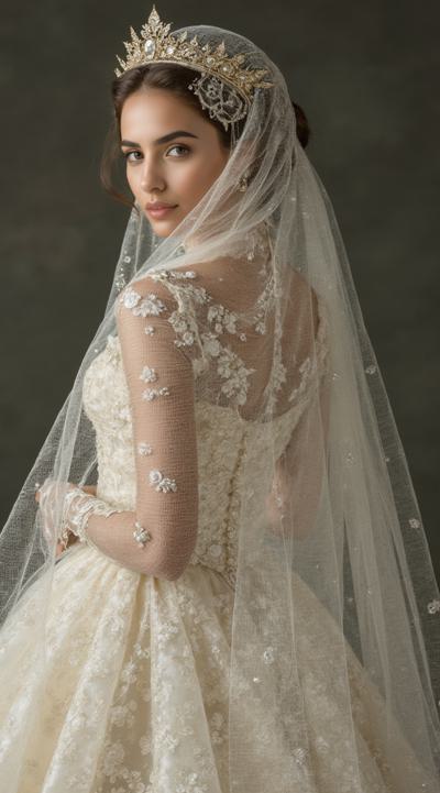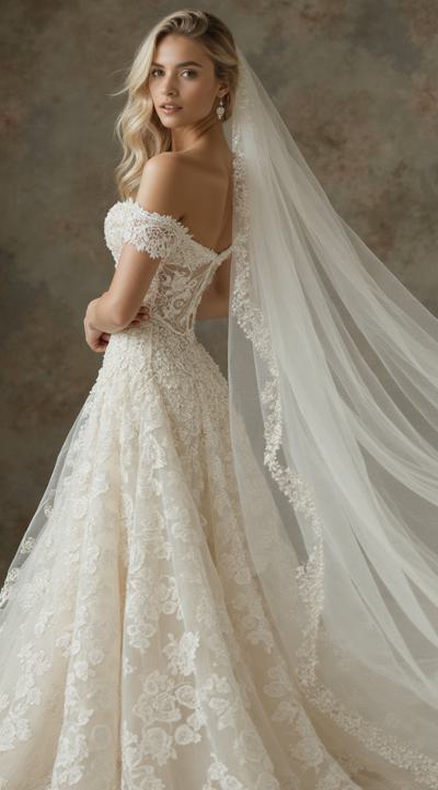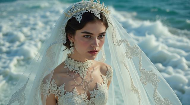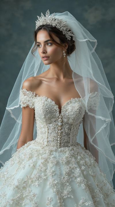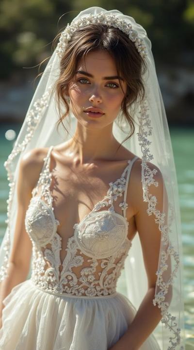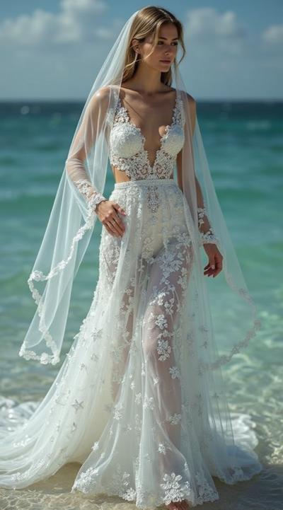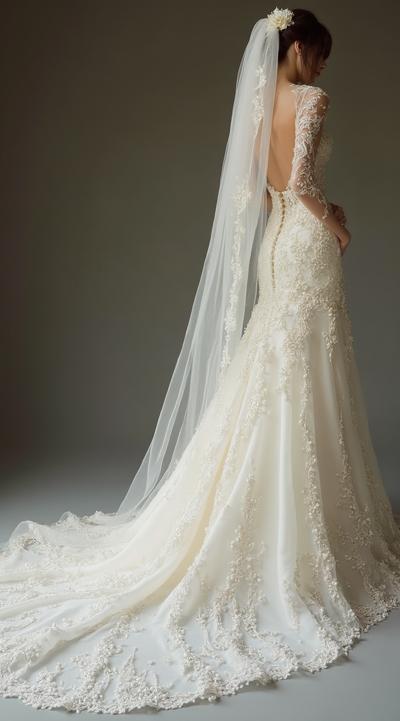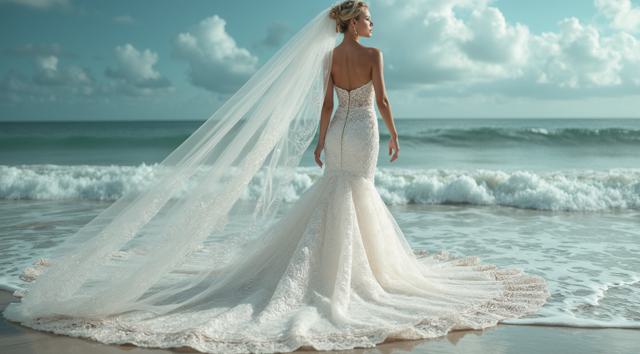 элегантное платье с жемчужными нитями пришитыми волнами по всей длине, фата из кружева,