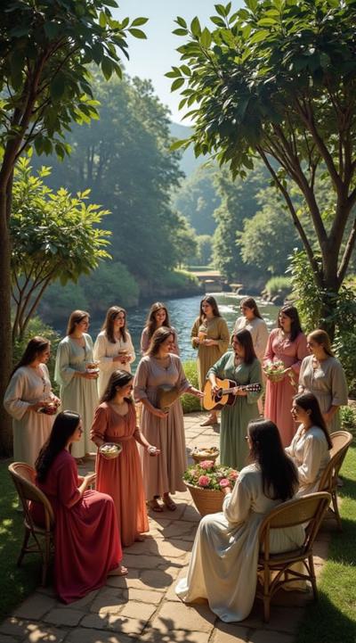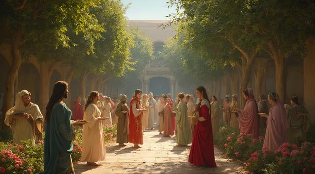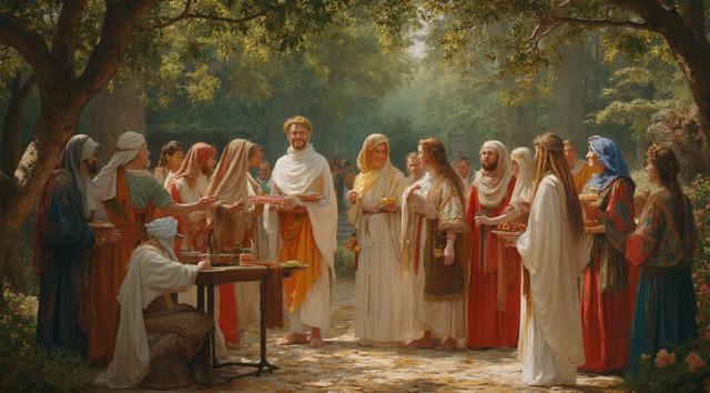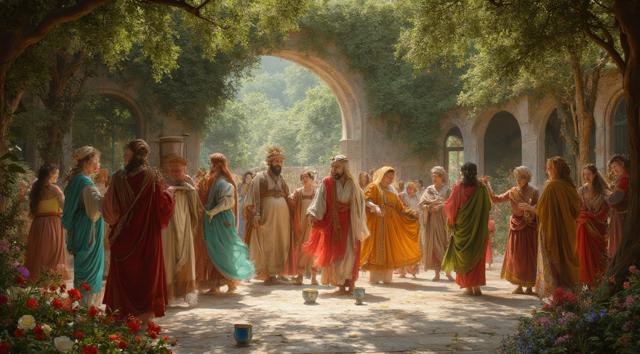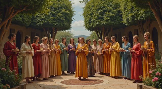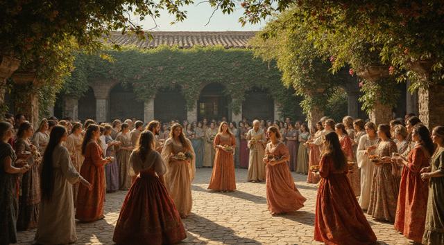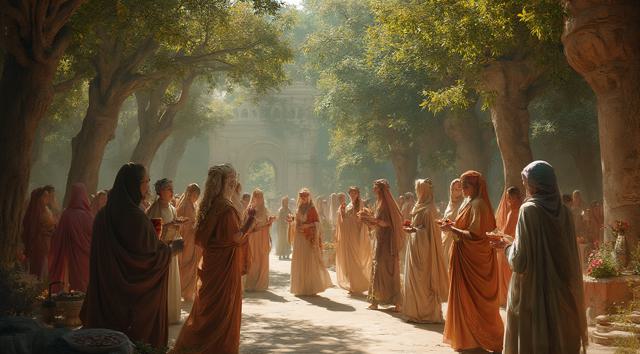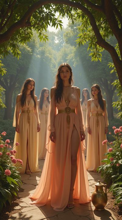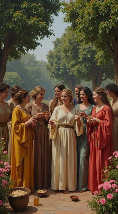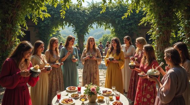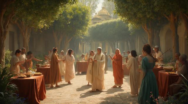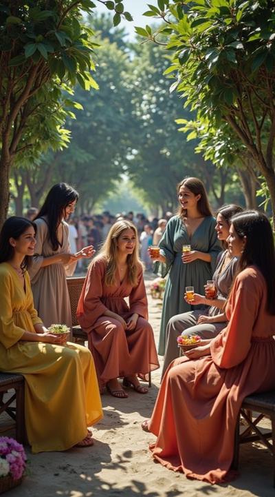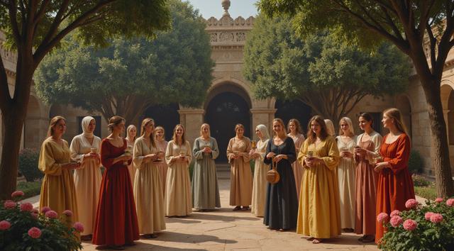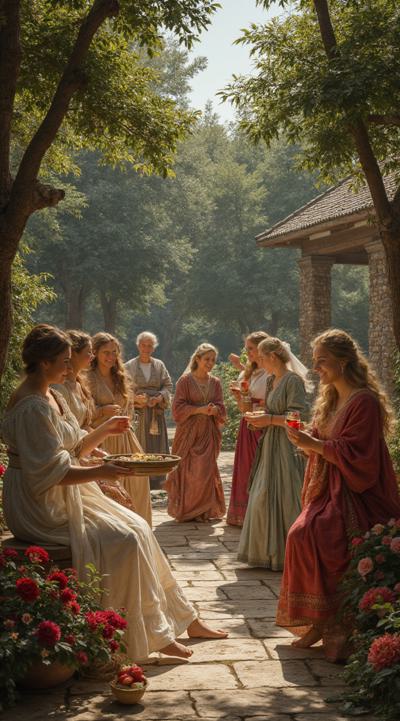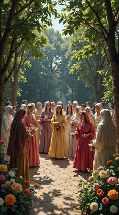 гарем женщин, восточные мотивы средних веков, летний сад, густые кроны деревьев, цветы, чаши с угощениями, кувшины с напитками, играют на музыкальных инструментах, танцуют, смеются, день, солнце, многослойность, драпировка, высокая детализация, полный рост, большое открытое пространство, во весь рост, динамика, , рисунок маслом, ренессанс, эпоха возрождения, готика, мрак