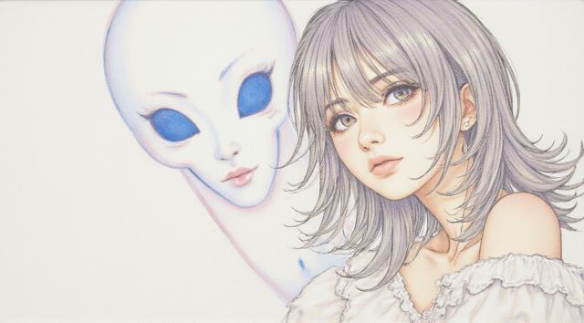 Yoshitaka Amano art, Ludwig Kakumei style, HDR sketch, bishoujo пытается вырваться, призрак прекрасной сциллы душит шею, ghostly entity, crystally clear drawing, aesthetically delicate art, metallic pastel colors, Junji Ito art