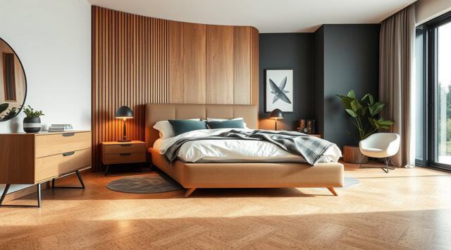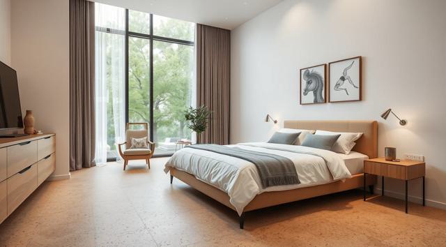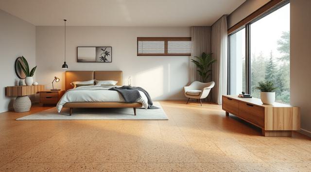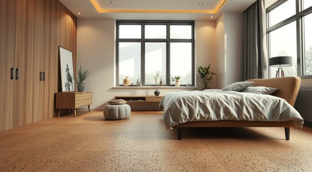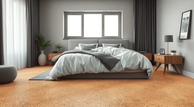 пробковое напольное покрытие крупным планом в интерьере современной спальни
