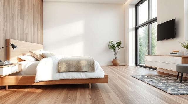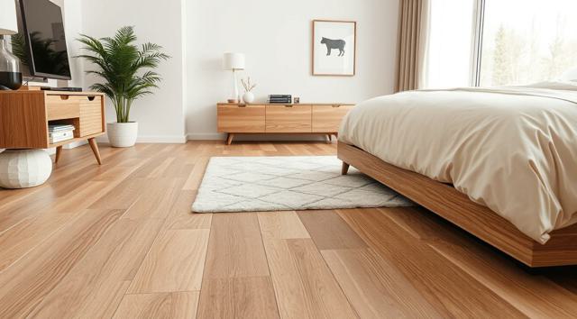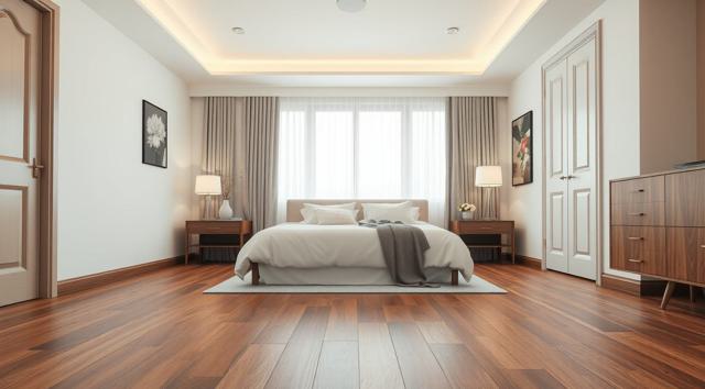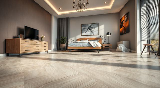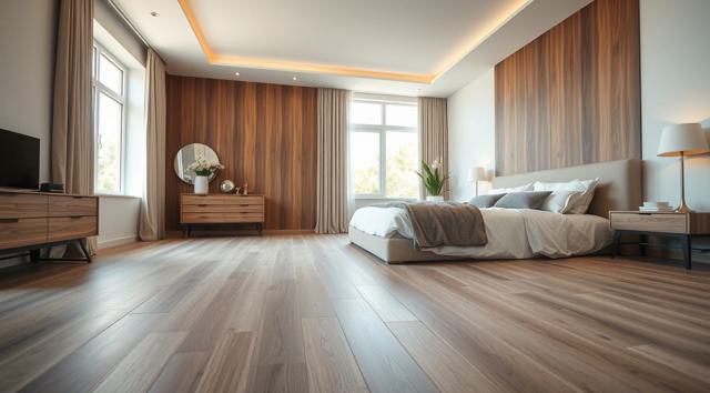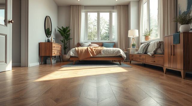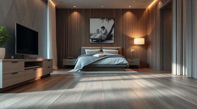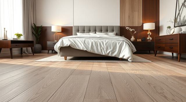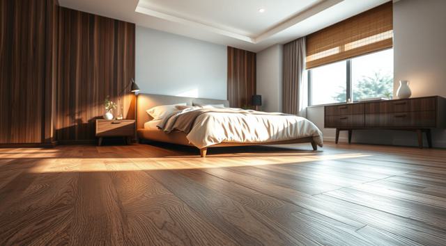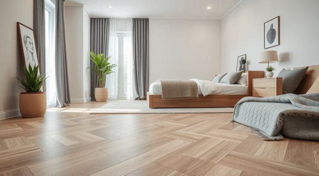 ламинат на полу крупным планом в интерьере современной спальни