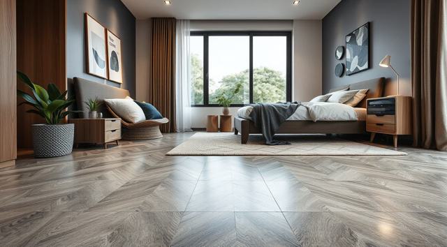 линолеум на полу крупным планом в интерьере современной спальни
