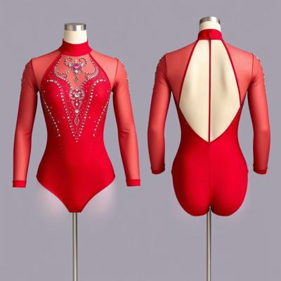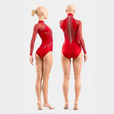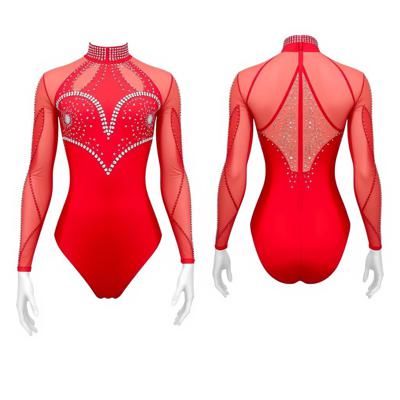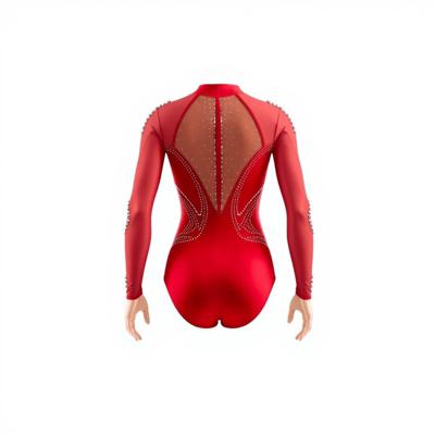 Купальник для спортивной гимнастики соревновательный с длинным рукавом красный с высокой горловиной, вырезом на спине, рукавами сеткой, с большим количеством страз