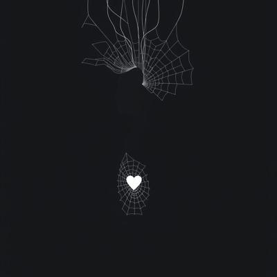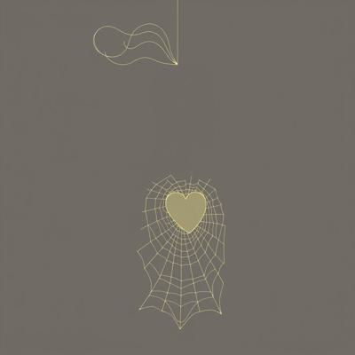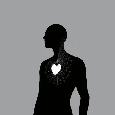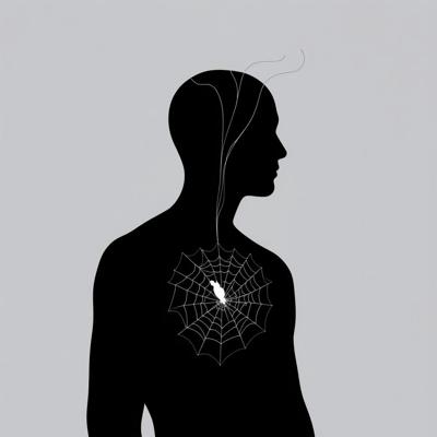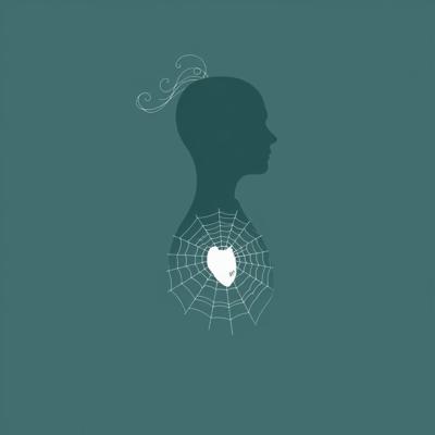 Minimalist vector illustration. A single human silhouette in profile. From the head and shoulders of the silhouette, fine, wispy spiderweb threads gently drift down. As they reach the chest and heart area, the threads weave together into a dense, geometric, and powerful net pattern. The background is clean. Two-color design: light grey for the silhouette and web, deep burgundy for the strong net. --v 6.0