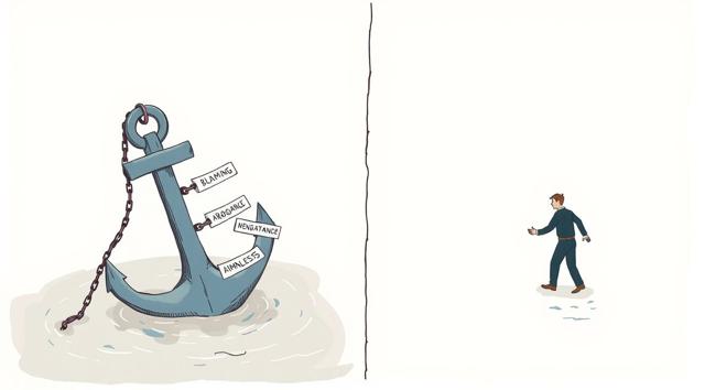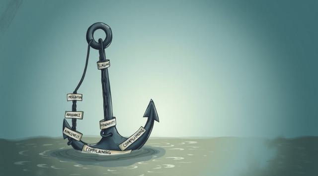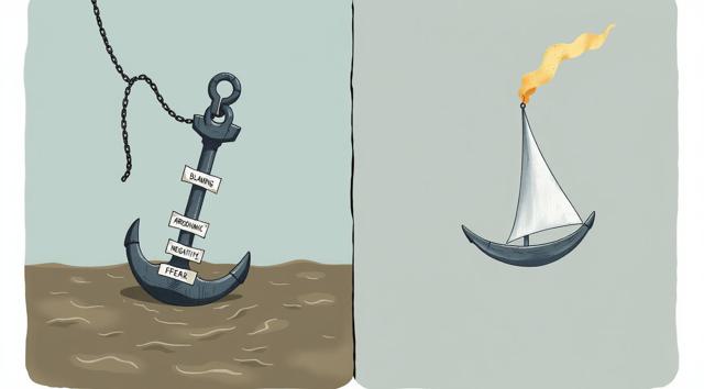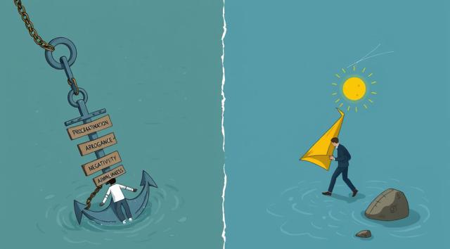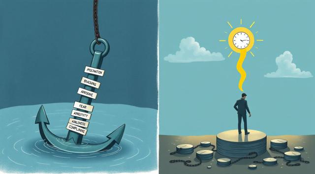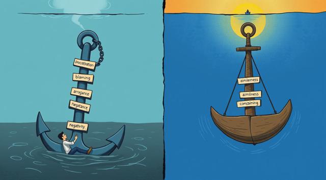 A conceptual illustration. On the left side, a heavy anchor is dragging a person down into murky water. The anchor is made of seven broken links of a chain, each inscribed with a word: Procrastination , Blaming , Arrogance , Fear , Negativity , Aimlessness , Complaining . On the right side, the same person is climbing a ladder made of repaired, strong links towards the sun. The ladder's steps are labeled: Awareness , Small Steps , Support , Praise , Planning . The style is modern metaphor, vector art, optimistic and motivating. Dual color scheme: cool blues on the left, warm yellows and greens on the right.