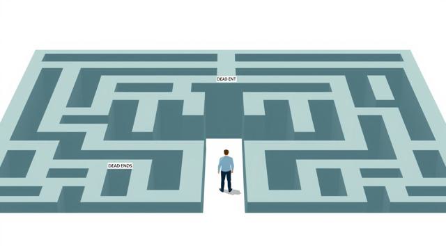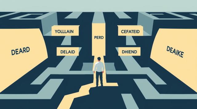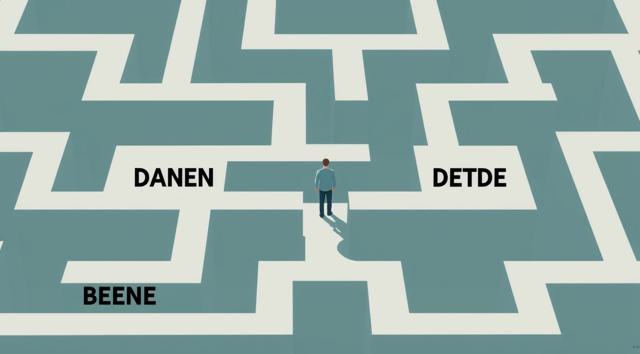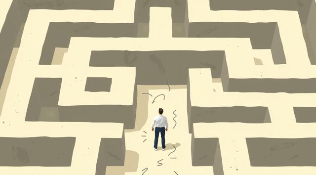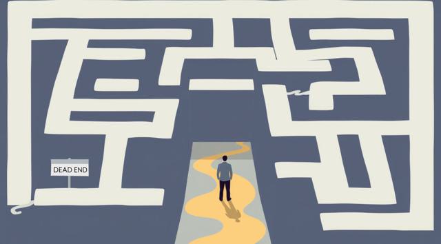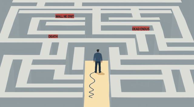 Стилизованный лабиринт, где 7 тупиков, куда можно будет вставить слова . В центре — человек, который начинает прокладывать новый путь к выходу.. Стиль: минимализм, плоская графика или полуреализм.