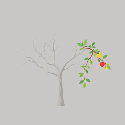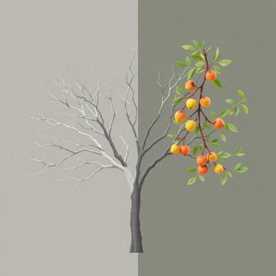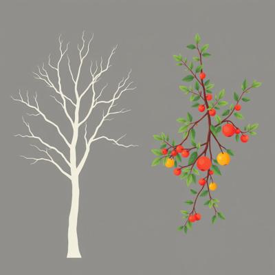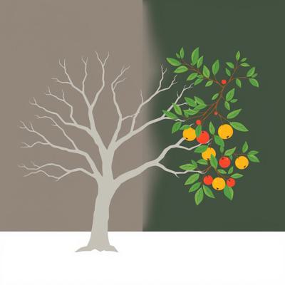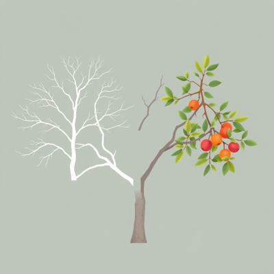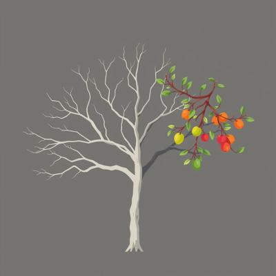 Дерево, где 7 ветвей слева — сухие, серого цвета. Справа — зелёные ветви с плодами. Стиль: минимализм, плоская графика или полуреализм.