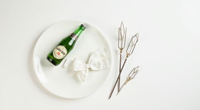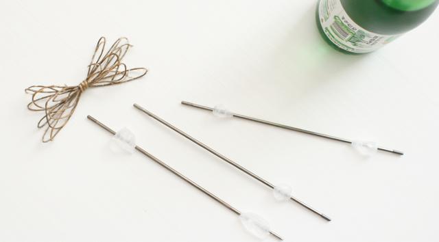 На белом столе лежат металлические шпажки, лук, стоит бутылка газированной воды, белый фон