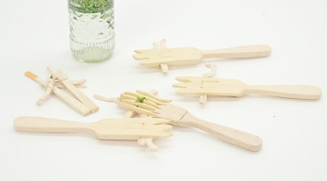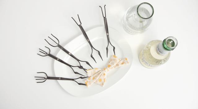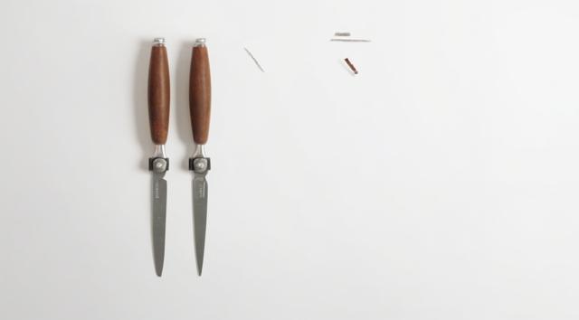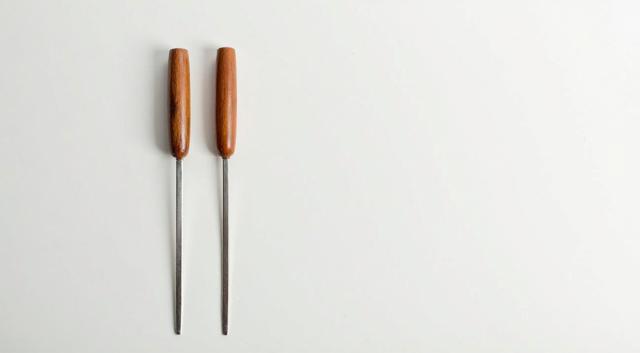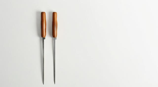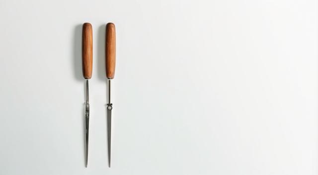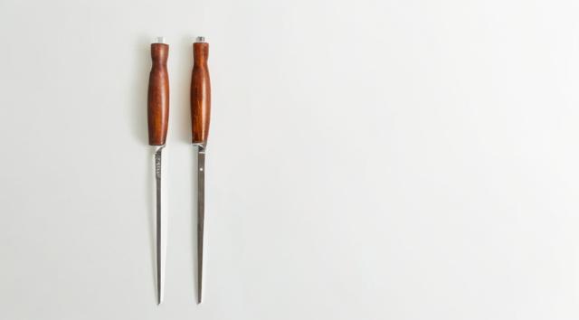 Белый стол, на нём лежит два металлических шампура с деревянными овальными ручками, [Вариации для #5959849 ]