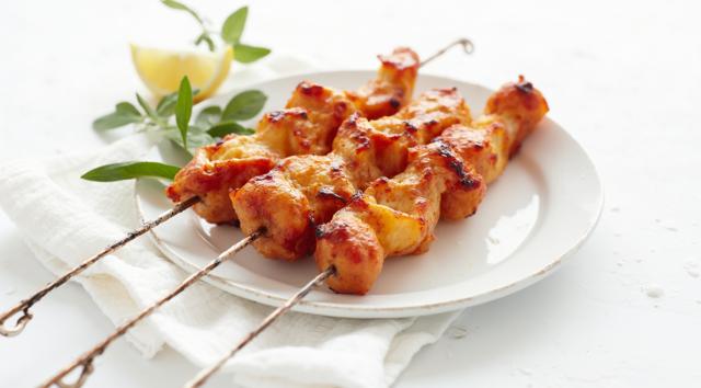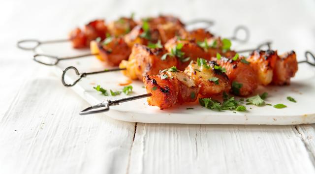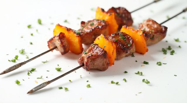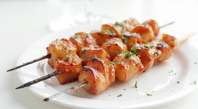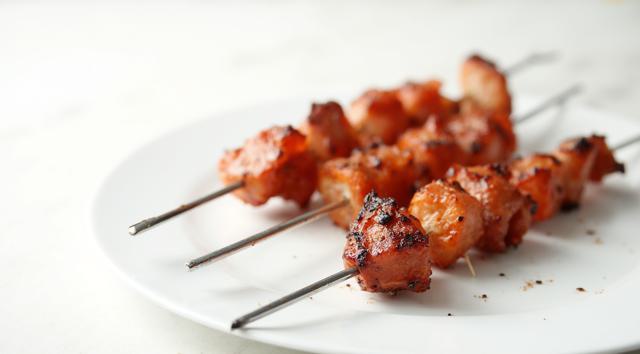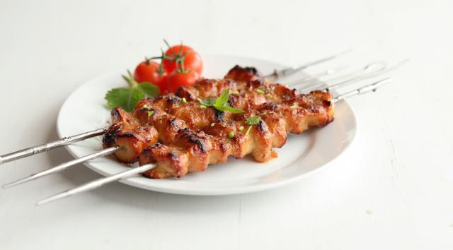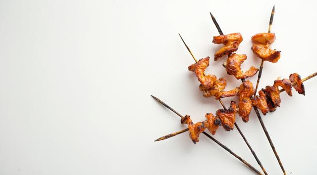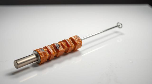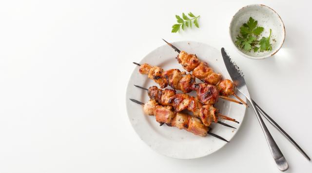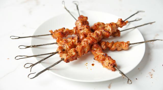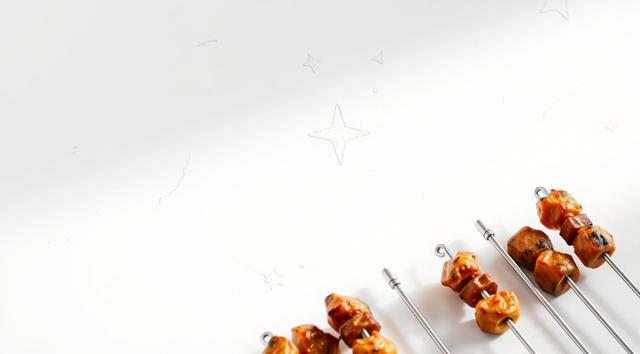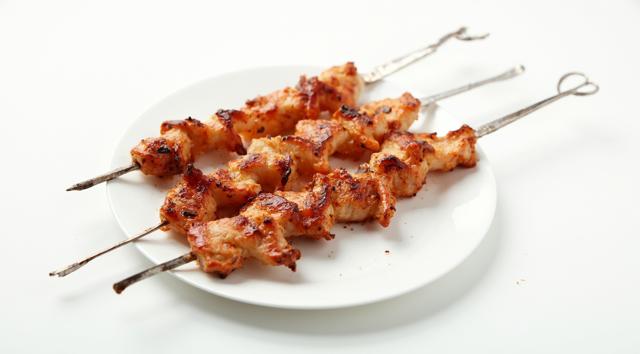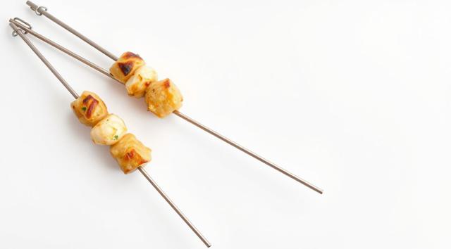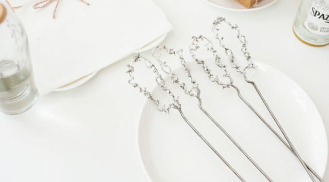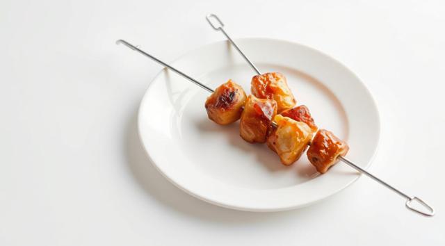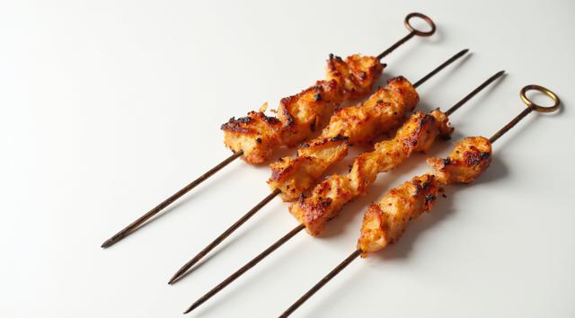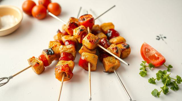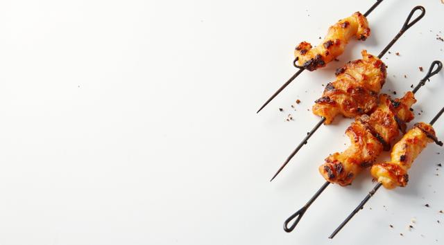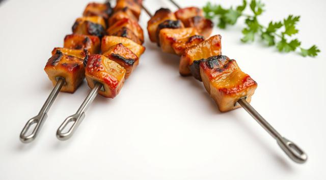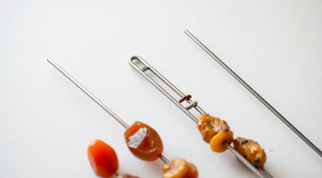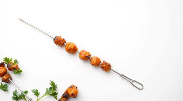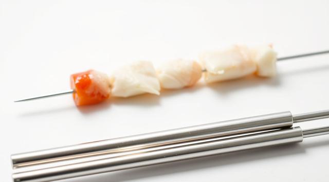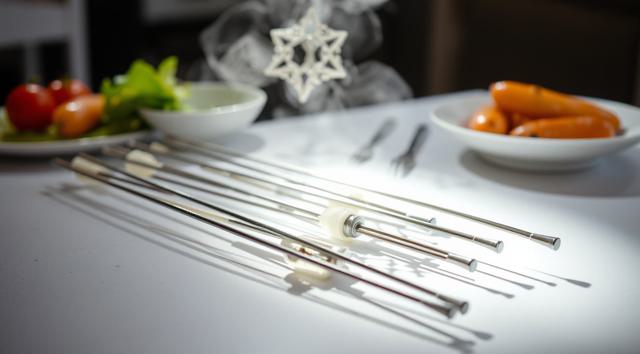 На белом столе лежат металлические шпажки для шашлыка, белый фон