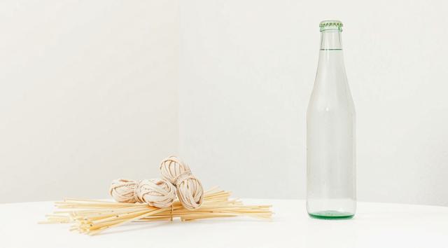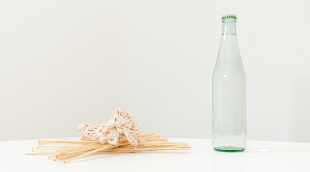 На белом столе лежат деревянные шпажки, лук, стоит прозрачная бутылка газированной воды, белый фон [Вариации для #5960632 ]
