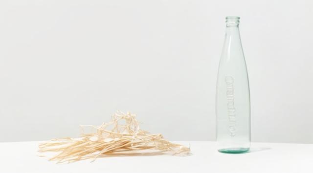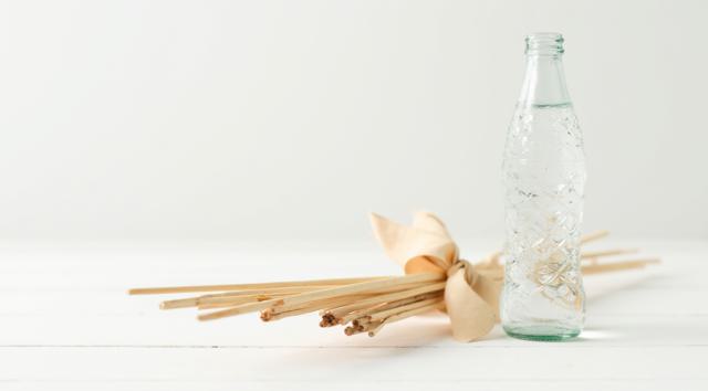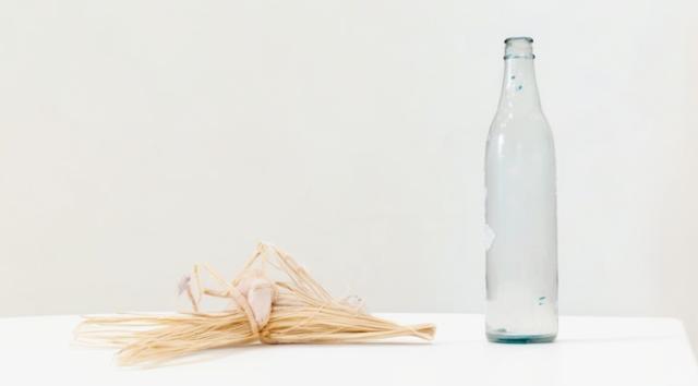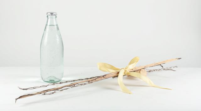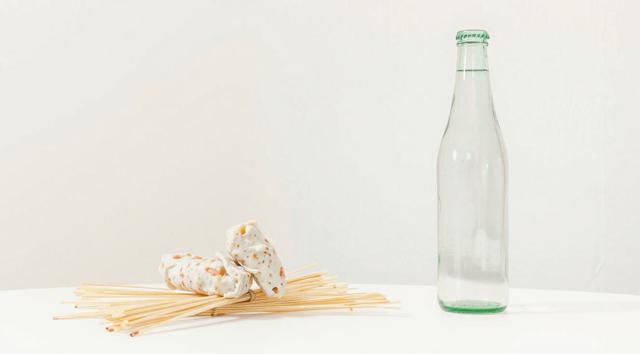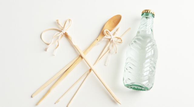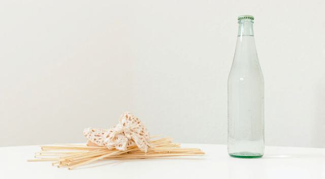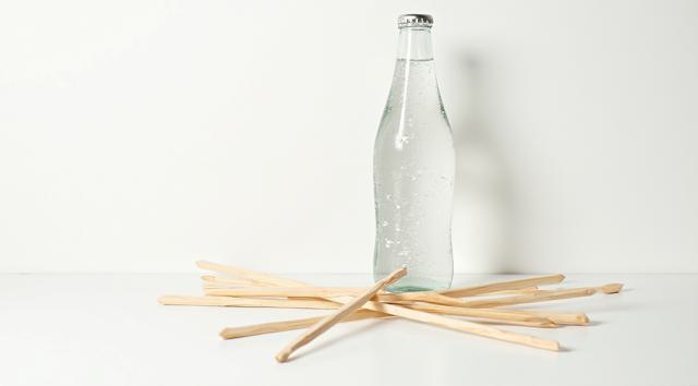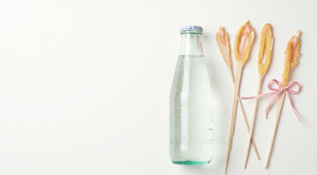 На белом столе лежат деревянные шпажки, лук, стоит прозрачная бутылка газированной воды, белый фон