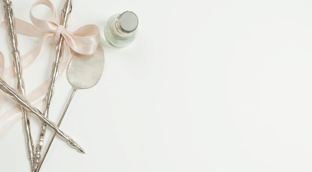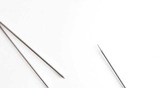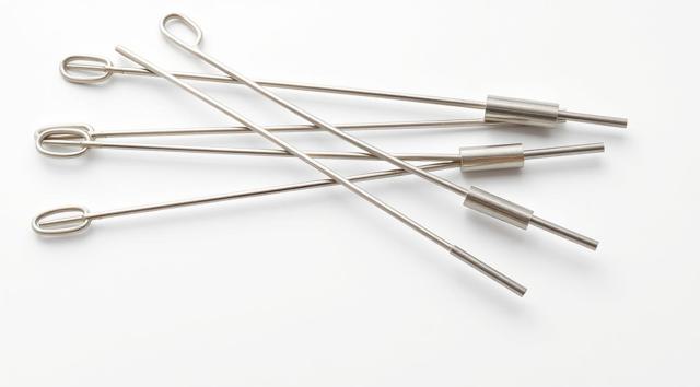 На белом столе лежат чистые металлические шпажки для шашлыка, белый фон