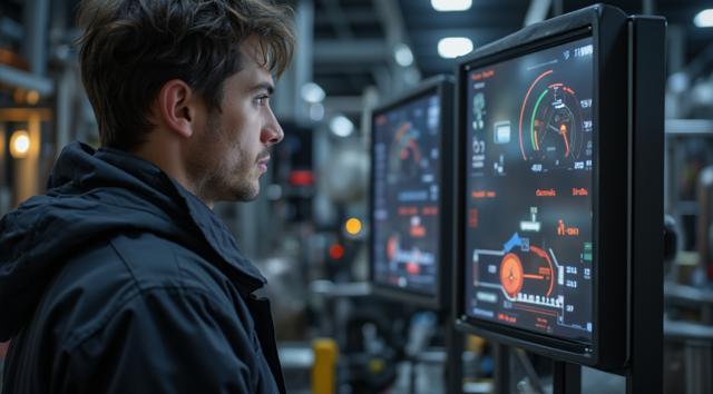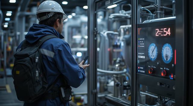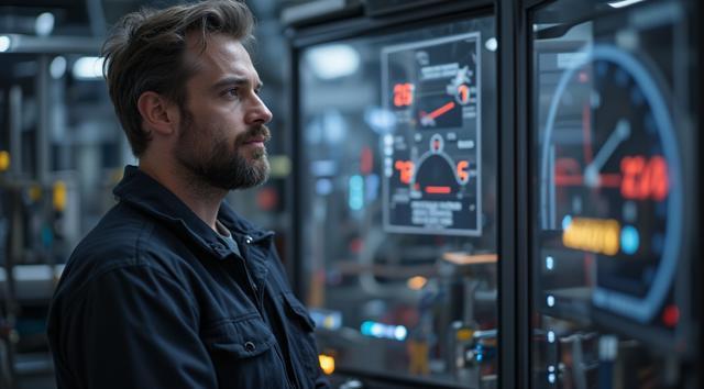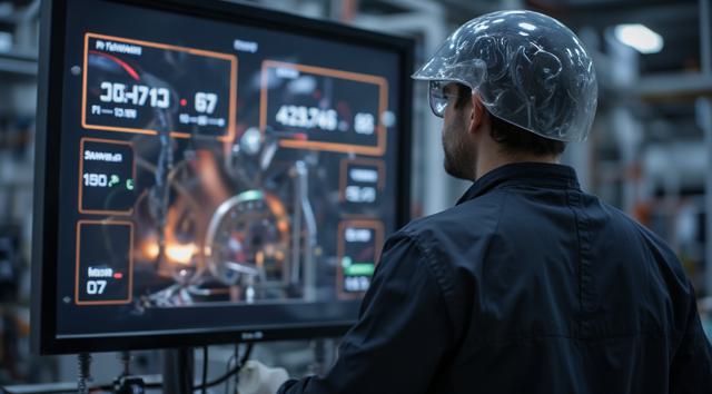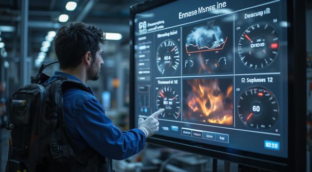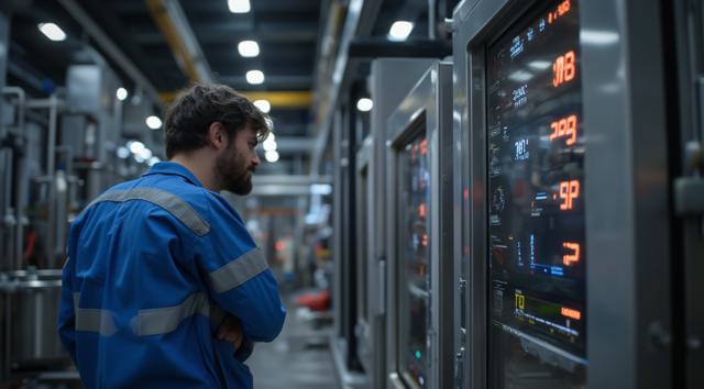 рабочий находится в помещении, где смотрит на табло с показателями температуры и давления. Перед рабочим расположен защитный экран, через который виден процесс коксования.,