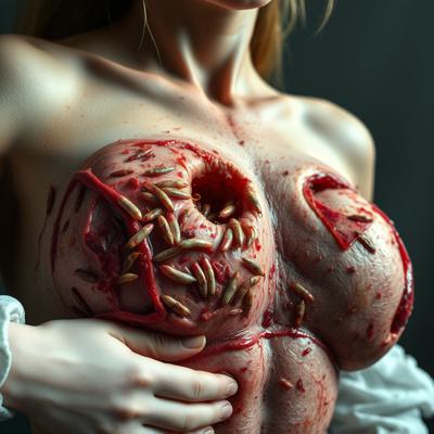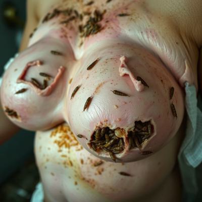 huge, large breasts infested with maggots, infected breast flesh, infected holes, maggots visible in breast flesh