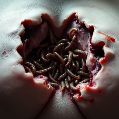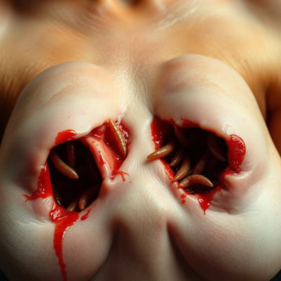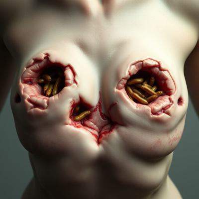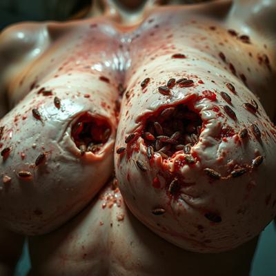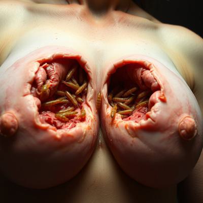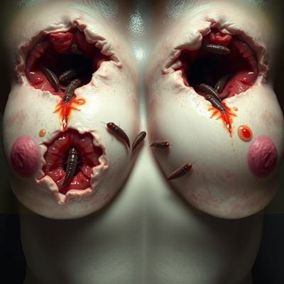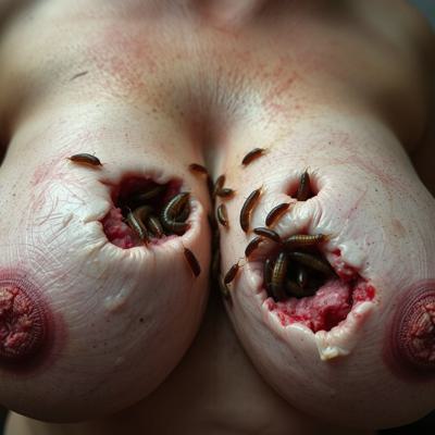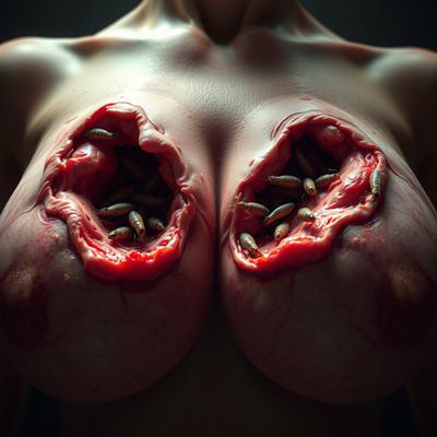 infected holes in the flesh of huge breasts, maggots swarming inside the flesh of the huge breasts, maggots in nipples