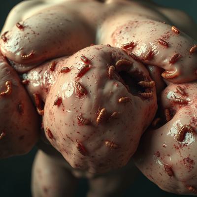 infected holes in the flesh of huge breasts, maggots swarming inside the flesh of the huge breasts.