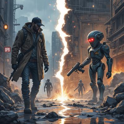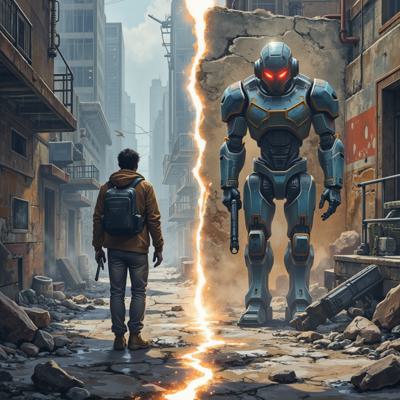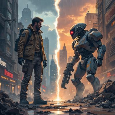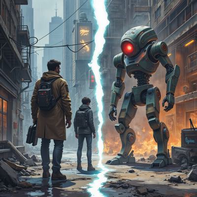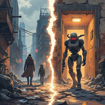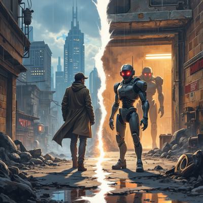 Обложка книги, драматическая разделённая сцена. Слева — дождливый киберпанк-город, грустный детектив и спокойный андроид-напарник. Справа — хаотичная разрушенная комната, зловещий лидер андроидов с красными глазами и роботизированной рукой-экскаватором. Их разделяет светящаяся трещина. Название: «Стеклянная кожа» потрескавшимся металлическим шрифтом. Тёмная эмоциональная атмосфера