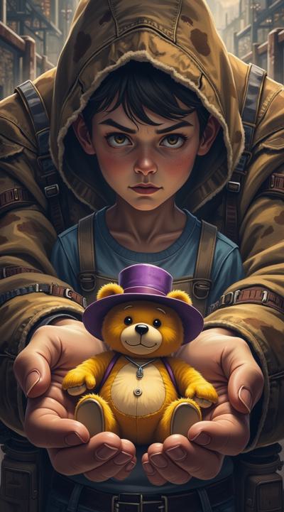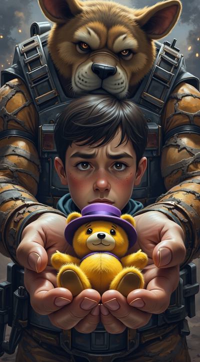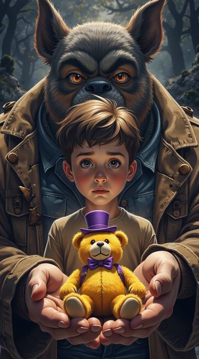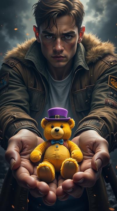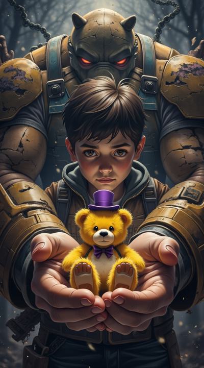 Крупный план.Подросток Кассэди в напряжении, смотрит на зрителя. За ним из тьмы — фигура Спрингтрапа. В его огромной, поврежденной руке, протянутой к сыну, бережно лежит старый желтый плюшевый мишка в фиолетовом цилиндре. Свет акцентирован на лице Кассэди и игрушке. Атмосфера — болезненная семейная связь, ужас и тоска, внешность Спрингтрапа идентична из игры FNAF 3