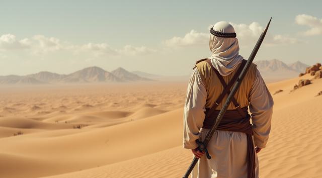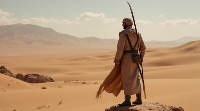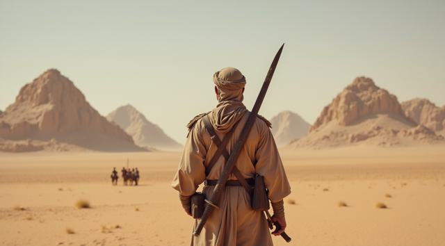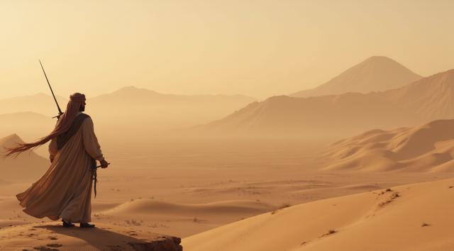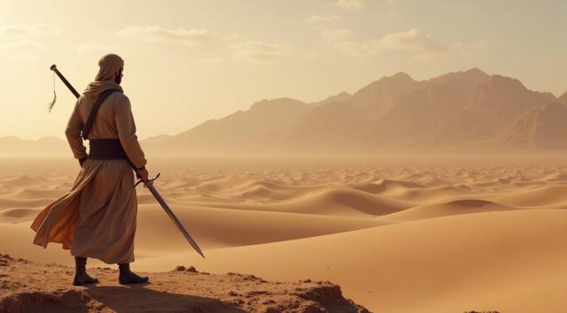Мужчина арабский войн с мечом стоит спиной и держит Меч на фоне гор пустыни