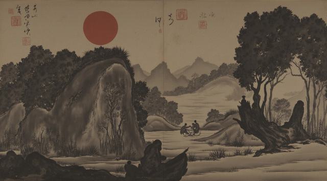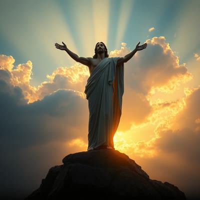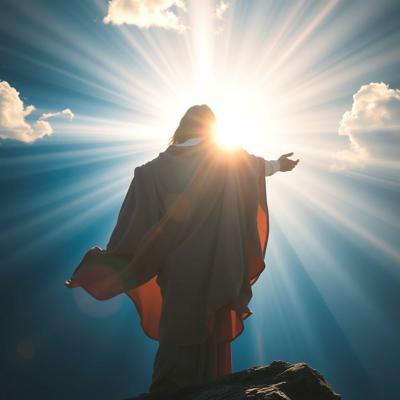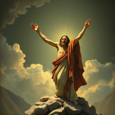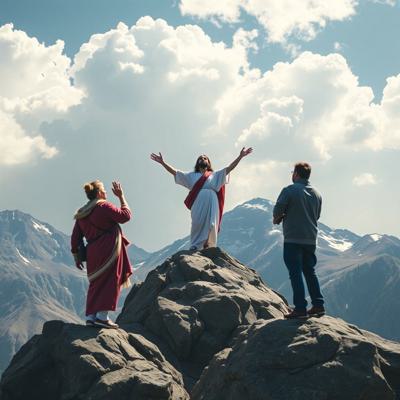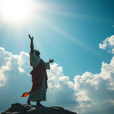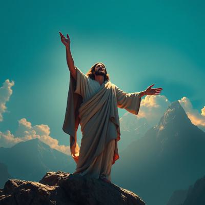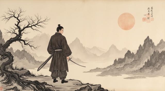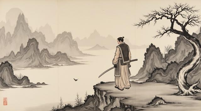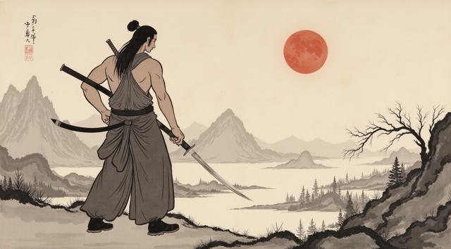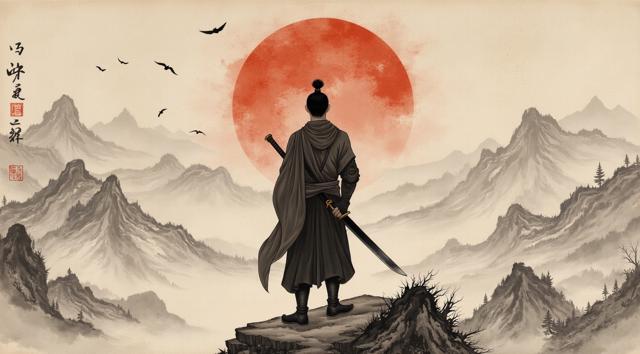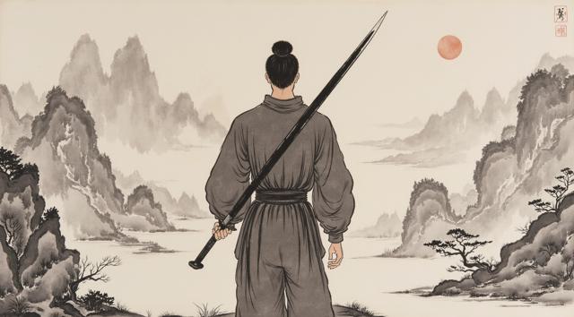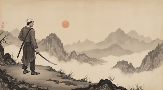 Мужчина с мечом стоит спиной и держит Меч на фоне гор