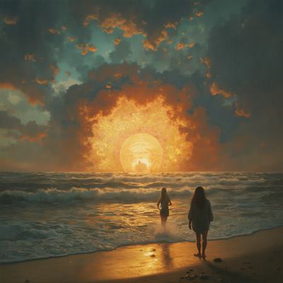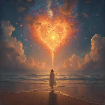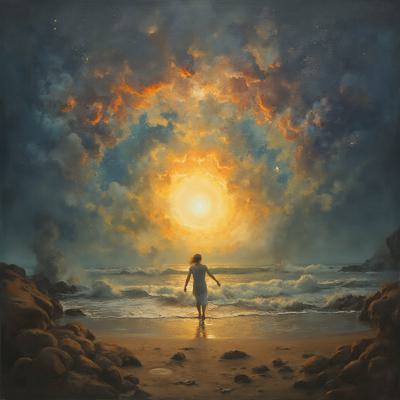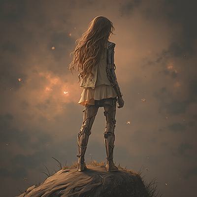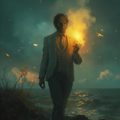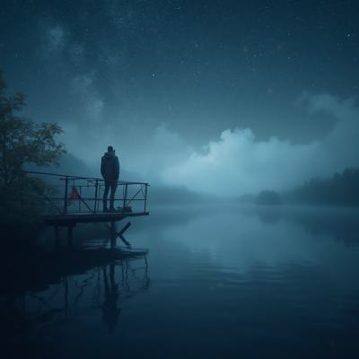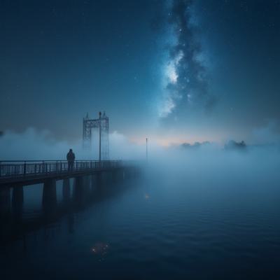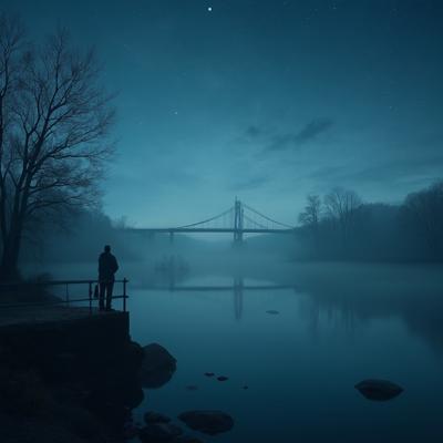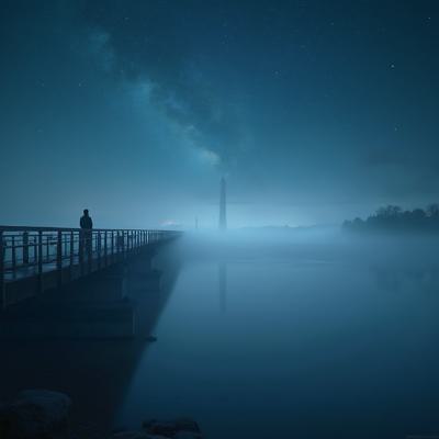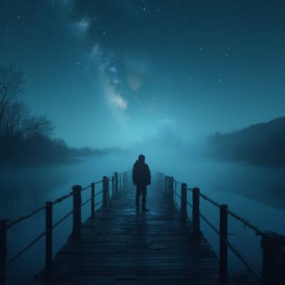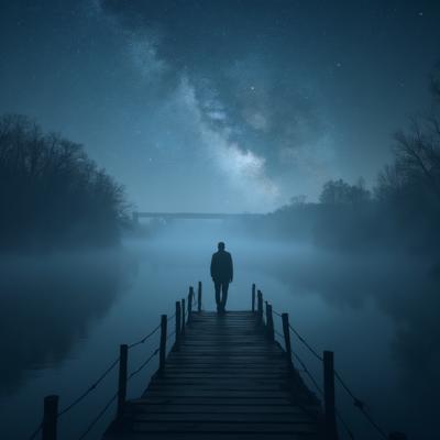 Туман на реке,через реку мост,на мосту силуэт одинокого мужчины,смотрит на звёздное небо