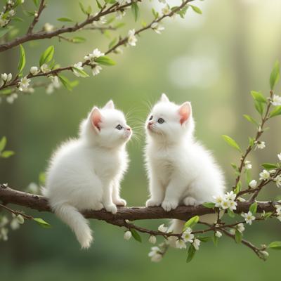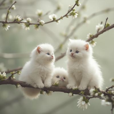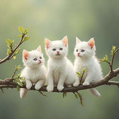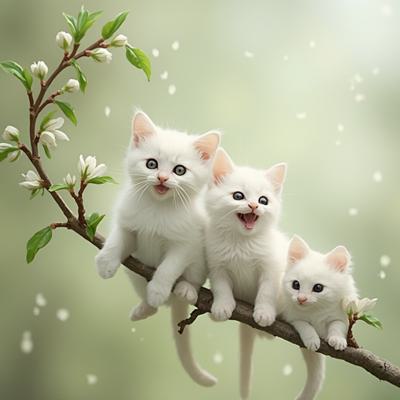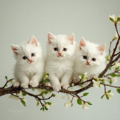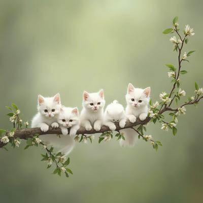 Веточка вербы,вместо почек сидят маленькие пушистые белые котята в разных красивых позах