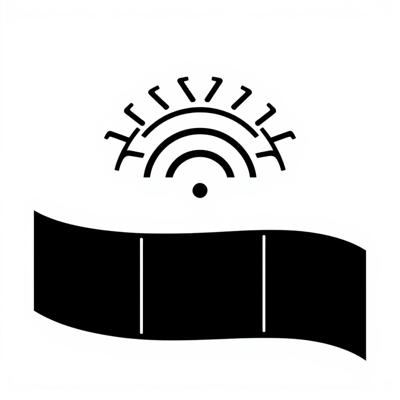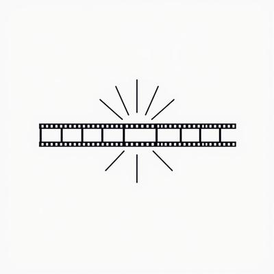 A minimalist logo icon, no text. A single, continuous line forms a film strip that seamlessly transforms into a radiating signal wave or sound wave. Represents Киноэфир (Cinema and Broadcast). Monoline, elegant, balanced. Single color, on transparent background. Vector style, scalable.