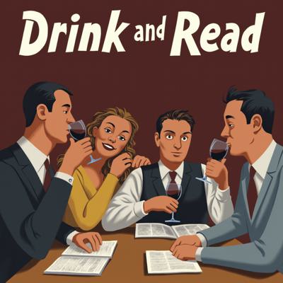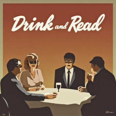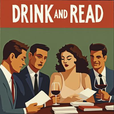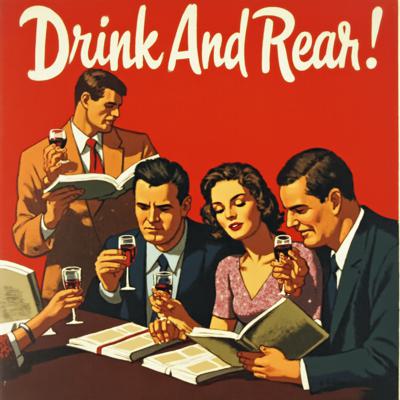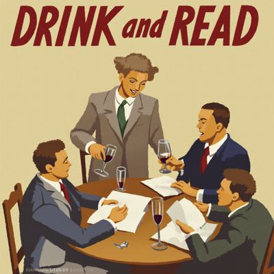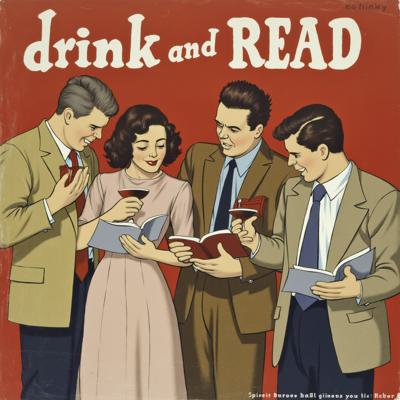 Трое мужчин англичан и одна девушка читают книги и пьют вино. Наверху текст Пей и читай