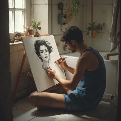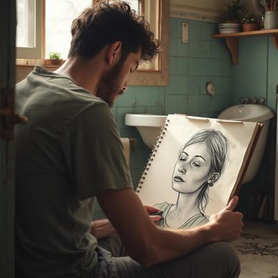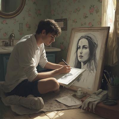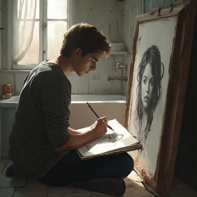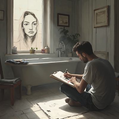 Уютная, слегка затенённая ванная комната. Молодой мужчина сидит на полу, прислонившись к стене, и сосредоточенно рисует в скетчбуке находящуюся там женщину. На бумаге — неоконченный, мастерский черно-белый набросок. Он детально прорабатывает лицо: веснушки, мягкие губы, выражение покоя. Женщина лежит в переполненной белой пене ванны. Видны только: её бледная шея, намёк на ложбинку у ключиц и длинные, мокрые пряди волос, свисающие через край ванны. Её лицо расслаблено, на щеках — лёгкий румянец, губы приоткрыты. Нет ни слез, ни напряжения, только совершенное умиротворение.Персонажи:· Он (художник): Его поза выражает полную погружённость. Взгляд постоянно перемещает...