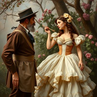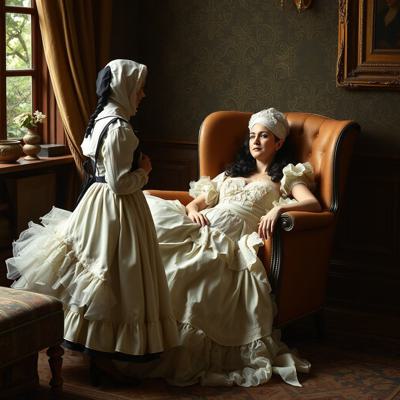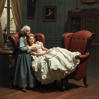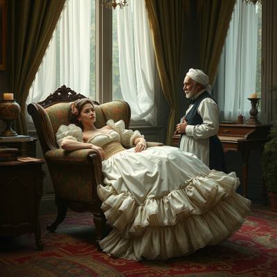 Молодая красавица плантаторша в шикарном кринолине лежит в кресле. Старый слуга стоит перед ней в почтительной позе