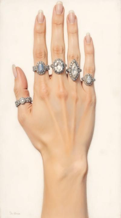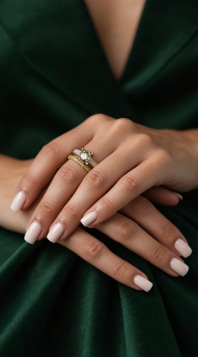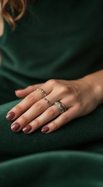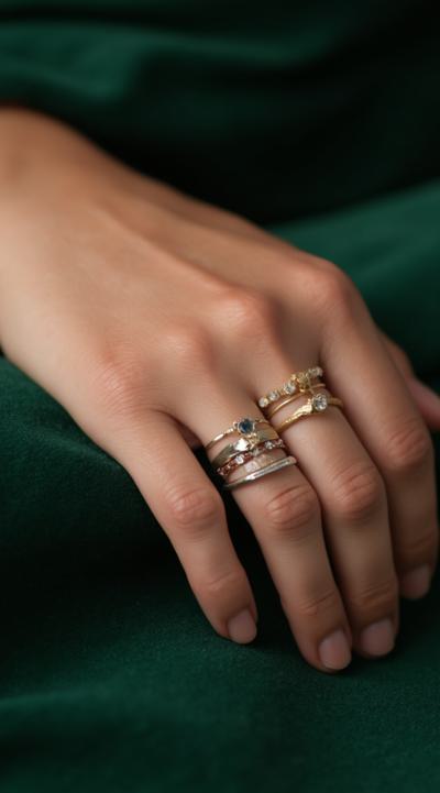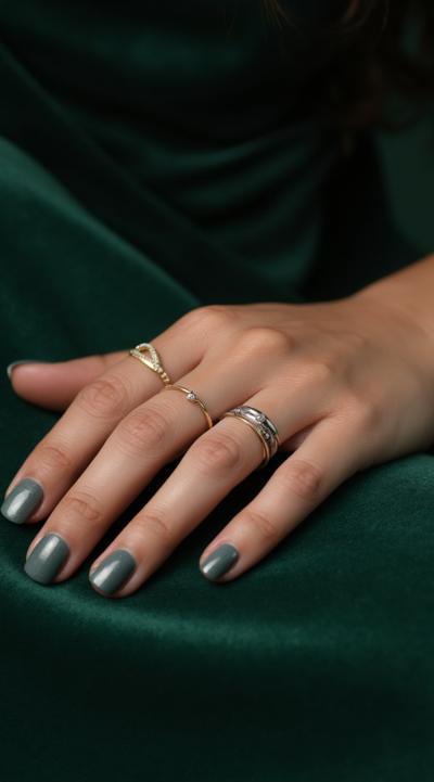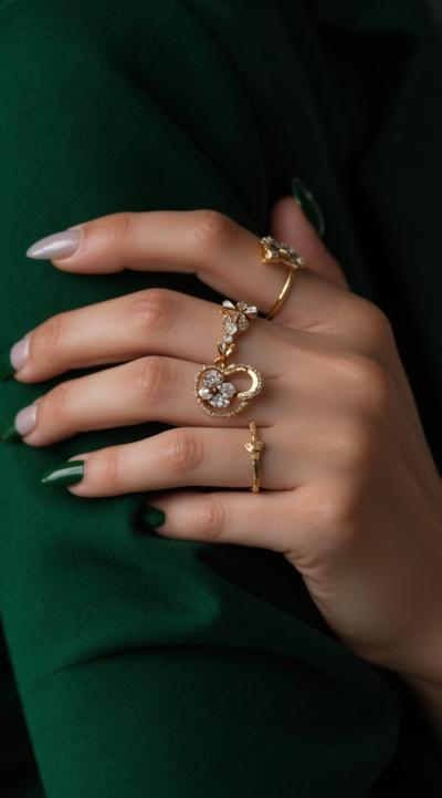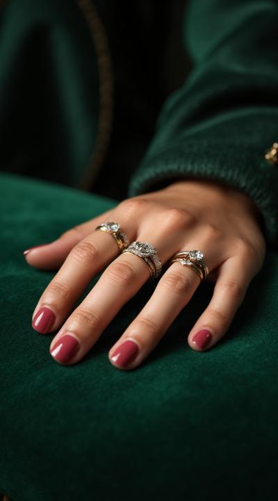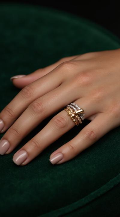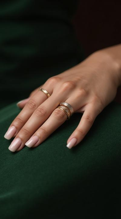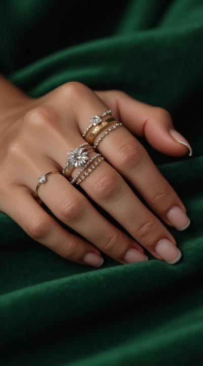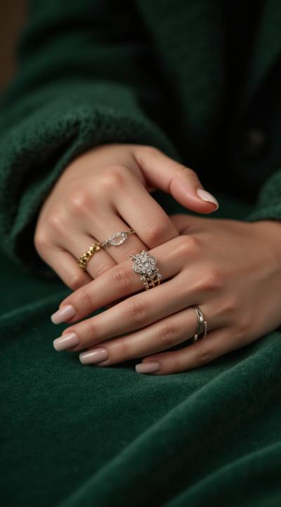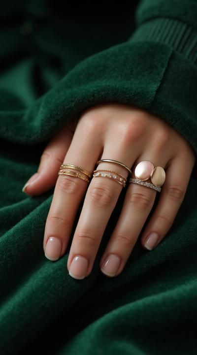 Close-up of an elegant woman's hand with stylish manicure, resting on green velvet. Several delicate gold and silver rings are stacked on the ring and middle fingers. Soft studio light, shallow depth of field, fashion magazine style, high detail