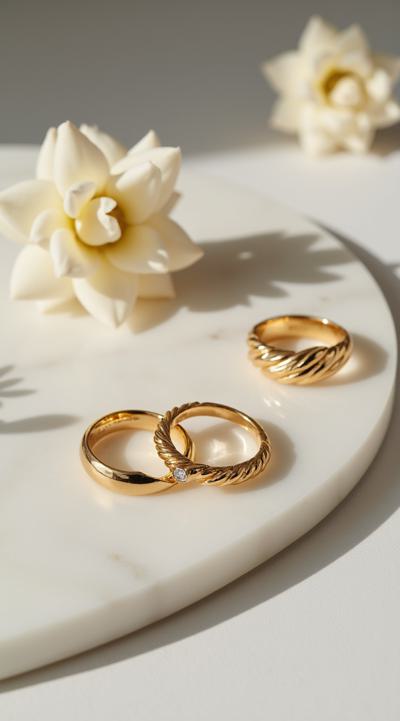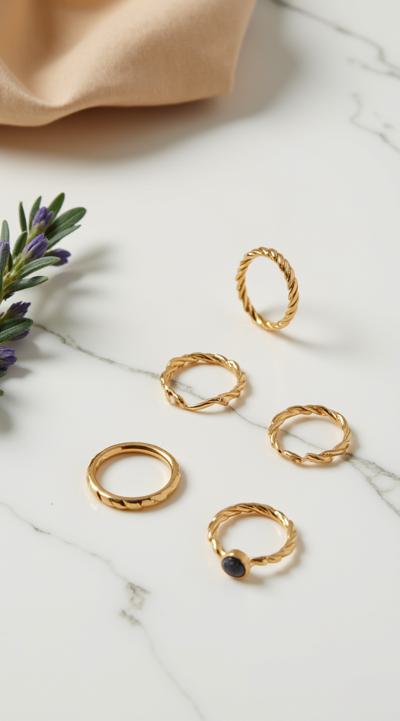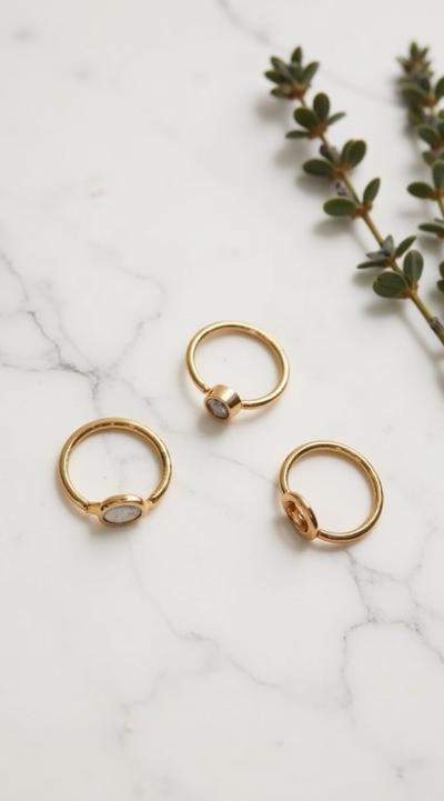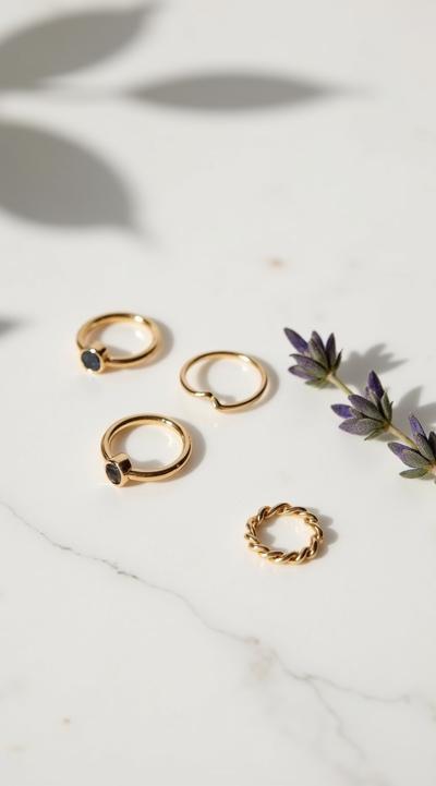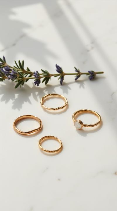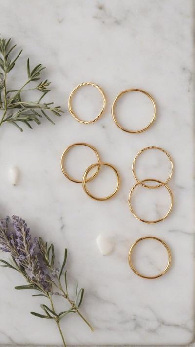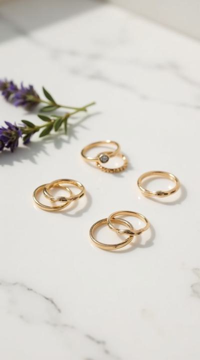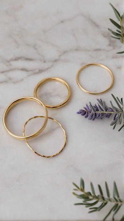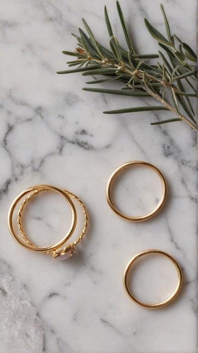 Flat lay. Стильная композиция на мраморной поверхности: три тонких золотых кольца (шинки) лежат отдельно, а одно витое кольцо с маленьким камнем находится чуть поодаль, как будто его сейчас добавят в компанию. Рядом веточка сухой лаванды или эвкалипта. Уютный, естественный свет, стиль минимализм, пинтерест-эстетика. Вертикальное фото 9:16.
