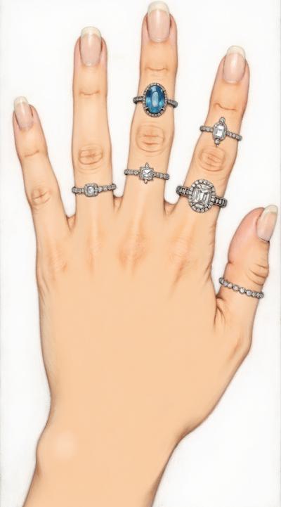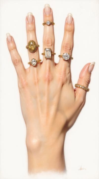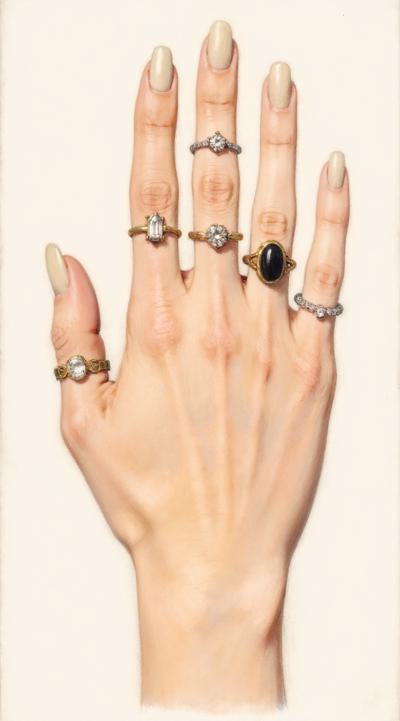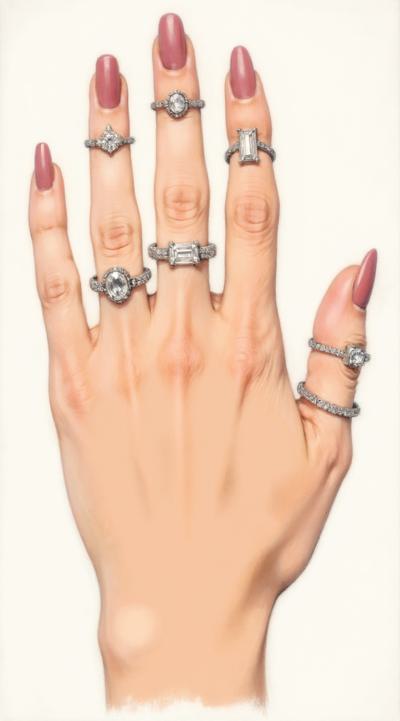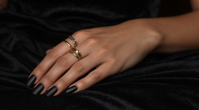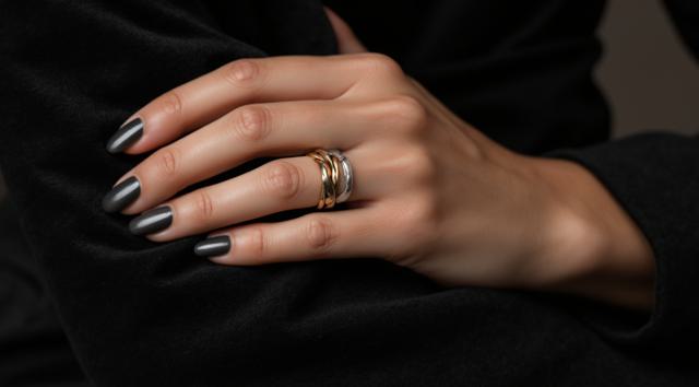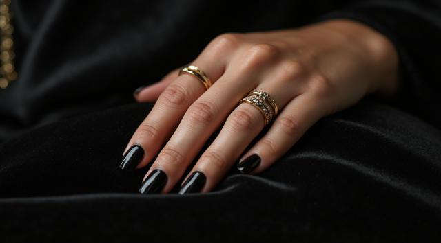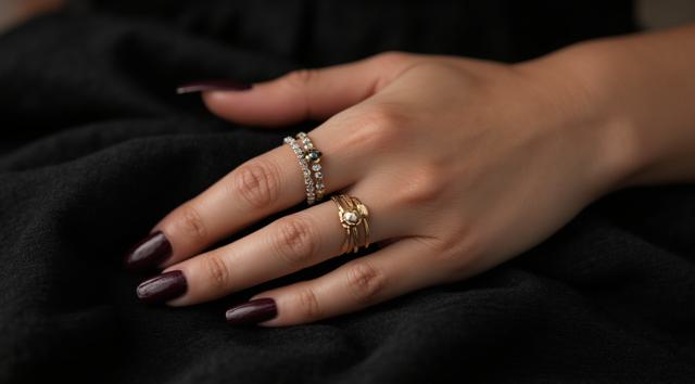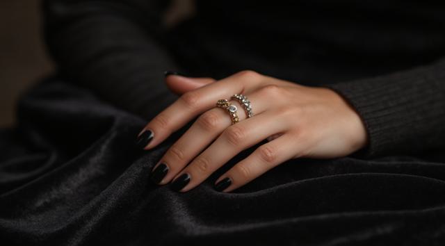 Close-up of a woman's elegant hand with a stylish manicure, resting on dark velvet fabric. She wears several delicate gold and silver rings stacked on her middle and ring fingers. Soft studio lighting, shallow depth of field, luxurious fashion magazine style, high detail, 8k.