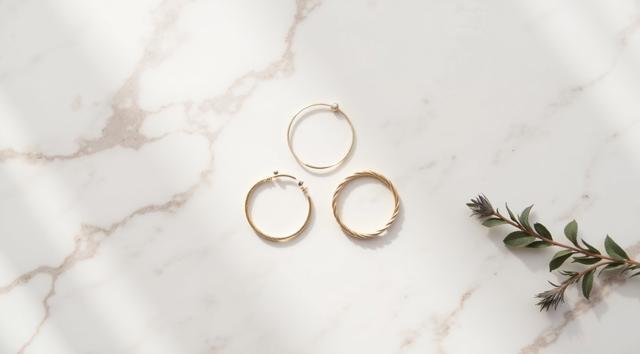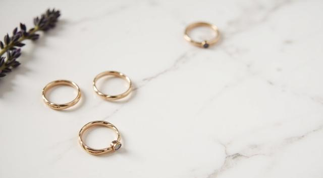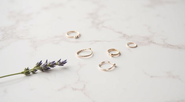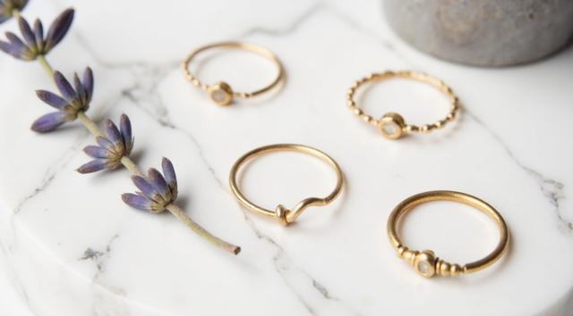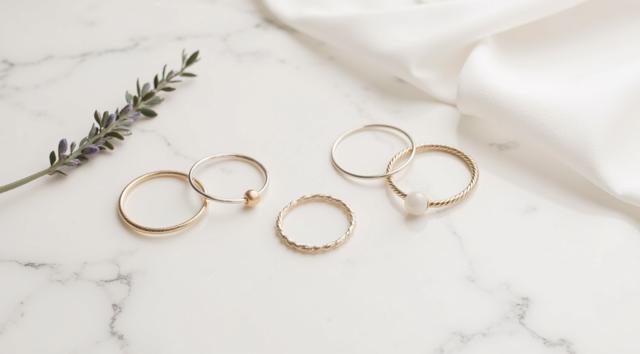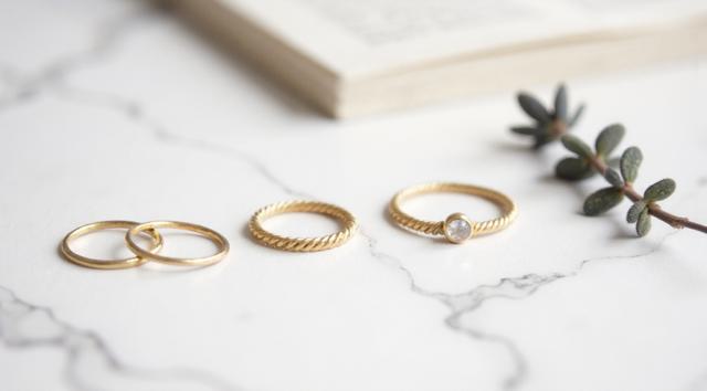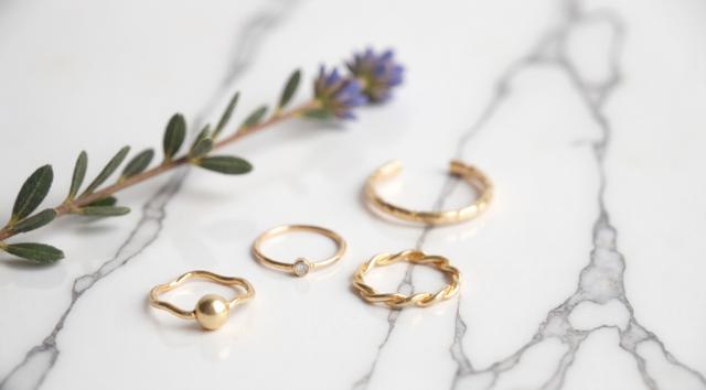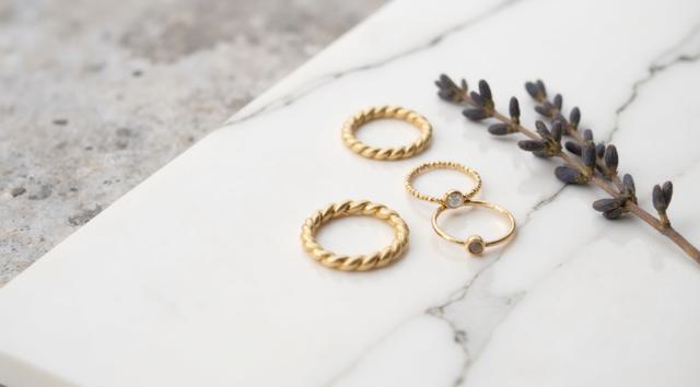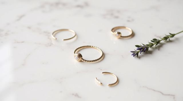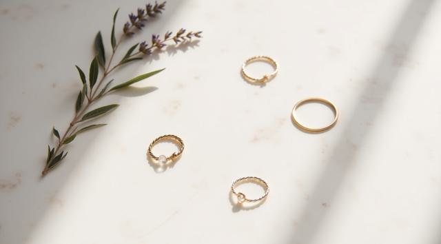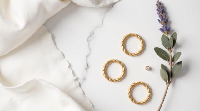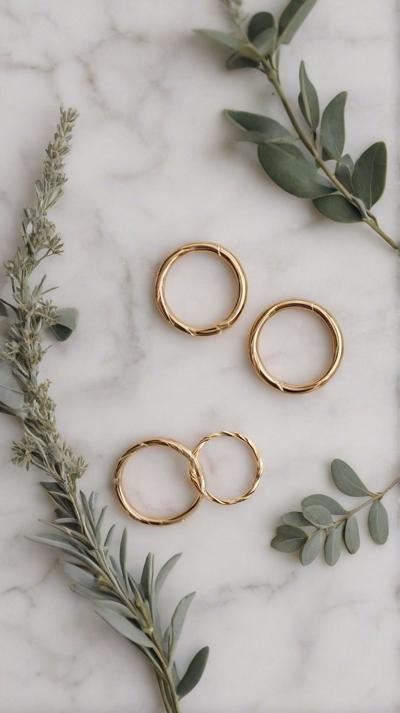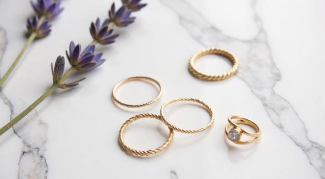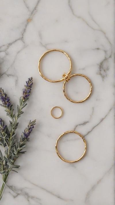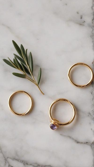 Flat lay. Стильная композиция на мраморной поверхности: три тонких золотых кольца (шинки) лежат отдельно, а одно витое кольцо с маленьким камнем находится чуть поодаль, как будто его сейчас добавят в компанию. Рядом веточка сухой лаванды или эвкалипта. Уютный, естественный свет, стиль минимализм, пинтерест-эстетика.