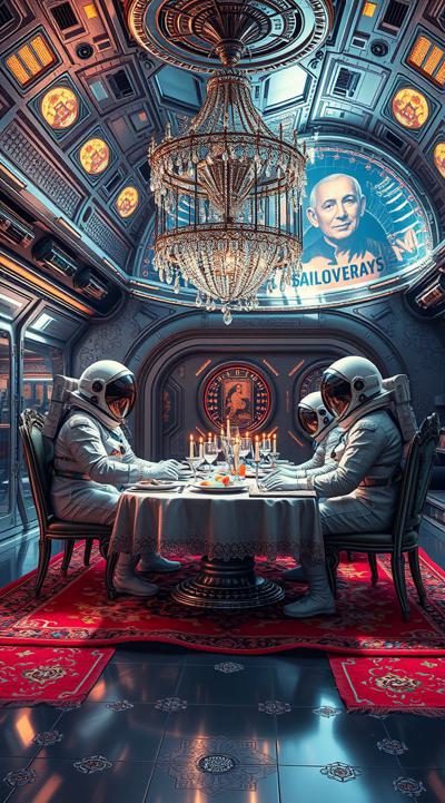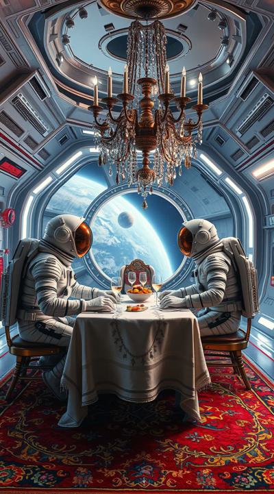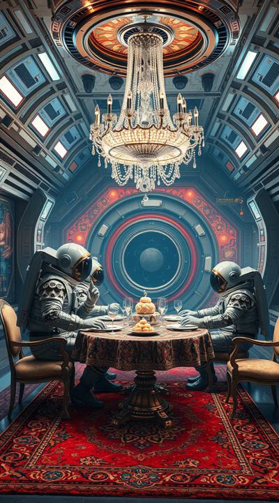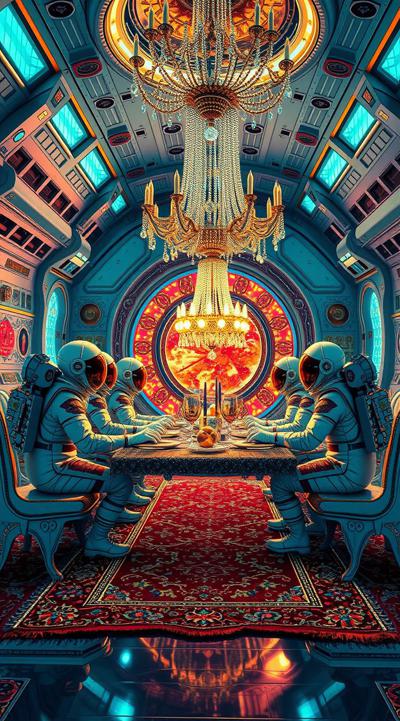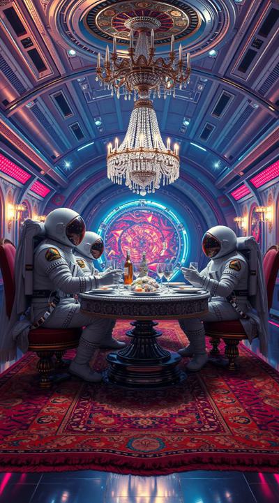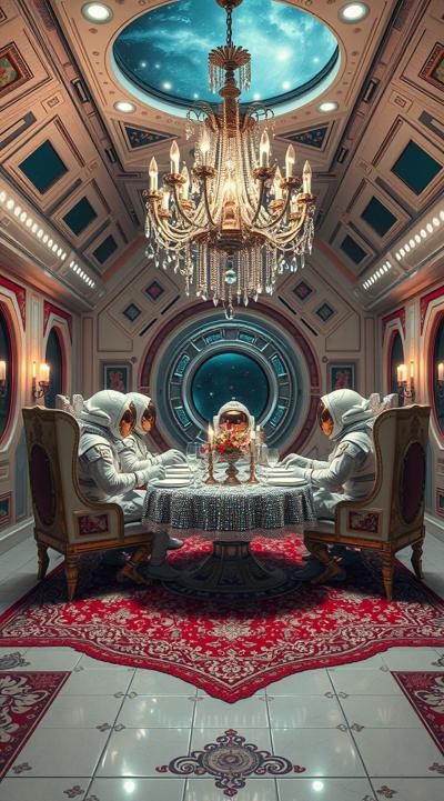 Цыганский стиль на космической станции далекое будущее, футуризм, космонавты в стразах ужинают пловом , Ковер на стене и на полу барокко и огромная люстра ультра реализм