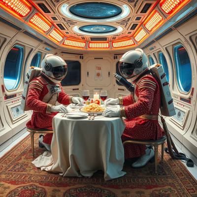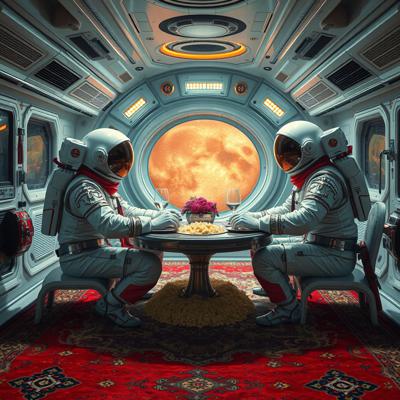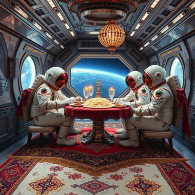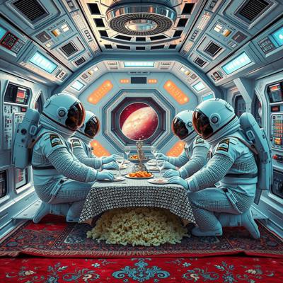 Цыганский стиль на космической станции далекое будущее, футуризм, космонавты в стразах ужинают пловом , Ковер на стене и на полу борокко