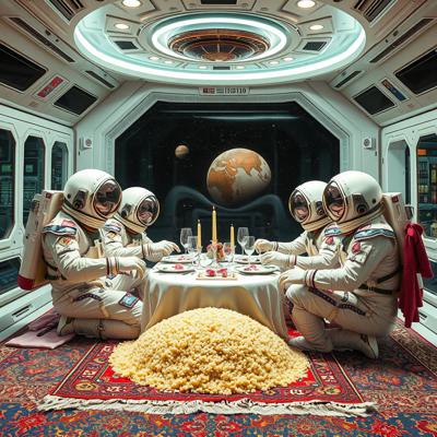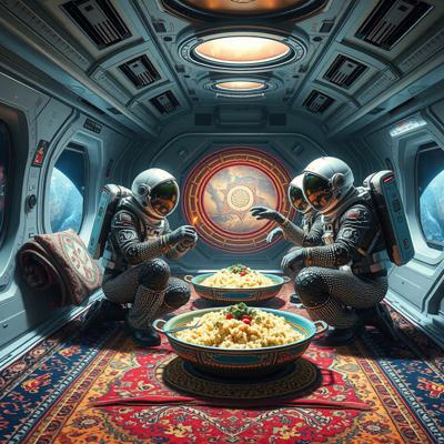 Цыганский стиль на космической станции далекое будущее, футуризм, космонавты в стразах ужинают пловом , Ковер на стене и на полу барокко и огромная люстра ультра реализм, На столе огромный казан с пловом и кальнаром