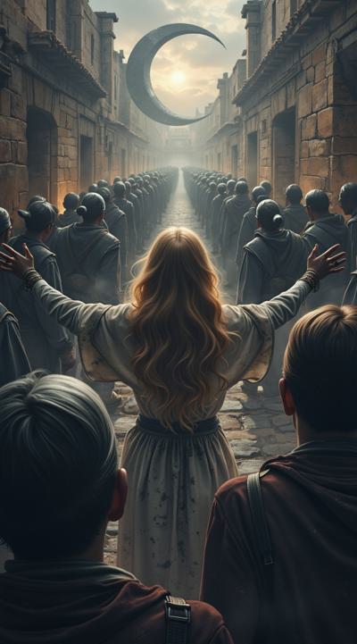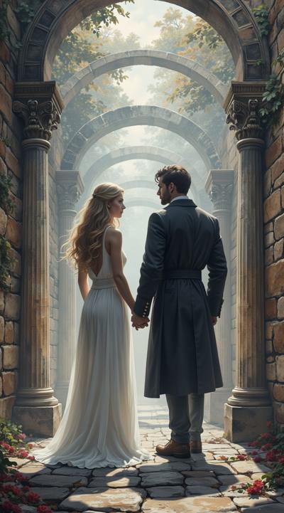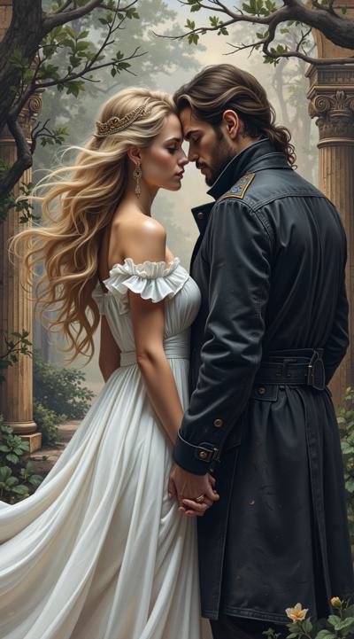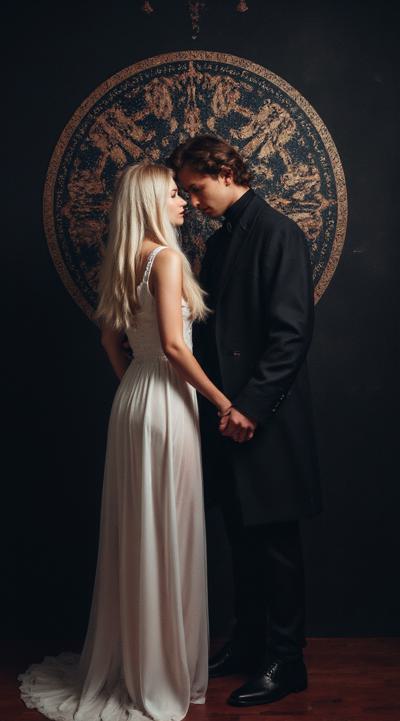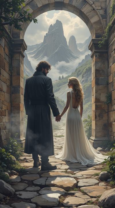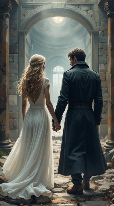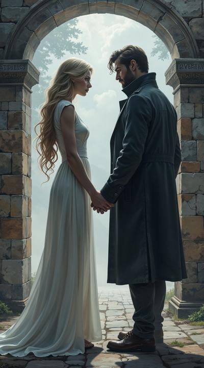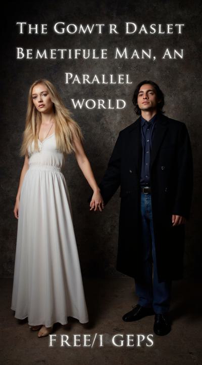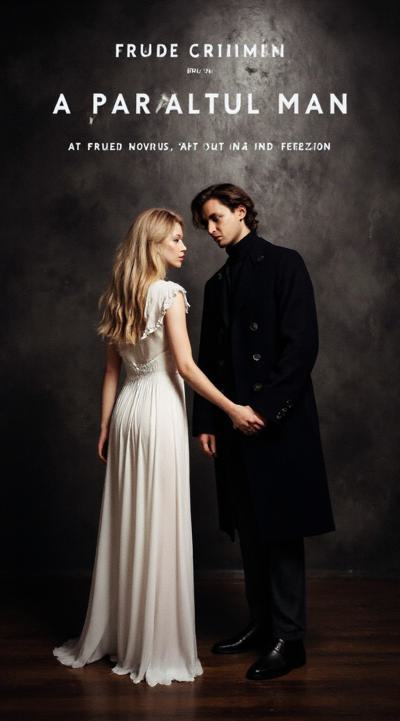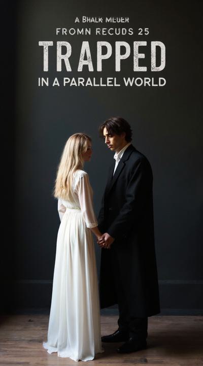 нарисуй обложку к Дарк роману про красивую молодую женщину, 25 с длинными светлыми волосами в белом длинном платье, попаданку в параллельный мир, к ней подходит стоит за спиной красивый мужчина демон 30 брюнет в чёрном пальто, злой и жестокий держит её за руку не отпуская. вокруг параллельный мир. фотореализм, высокое качество, HD. 9:16 несколько вариантов