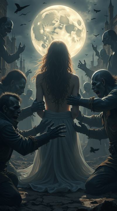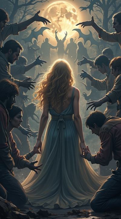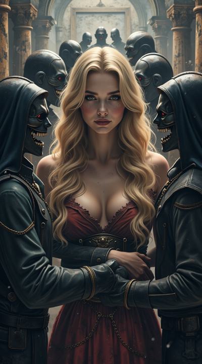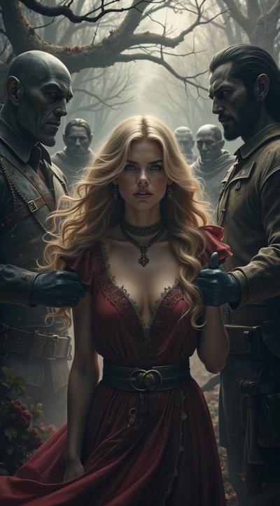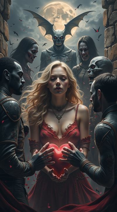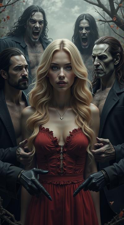 нарисуй обложку к Дарк роману про девушку попавшую в,параллельный мир вампиров, где нет ни одной женской особи кроме неё. красивая девушка с длинными светлыми роскошными волосами в объятиях вампиров. фотореализм, рендер, высокое качество HD.