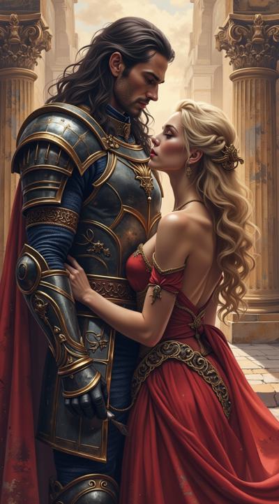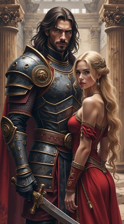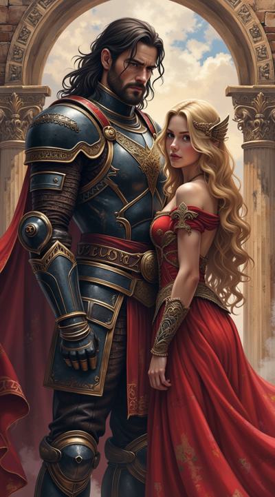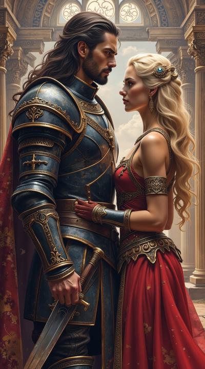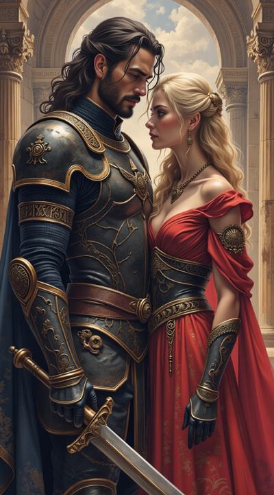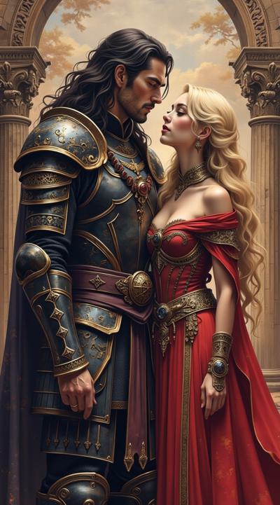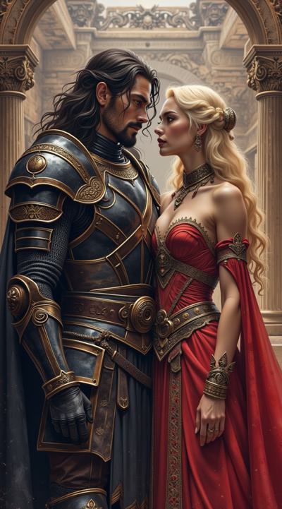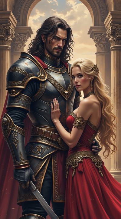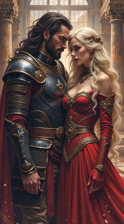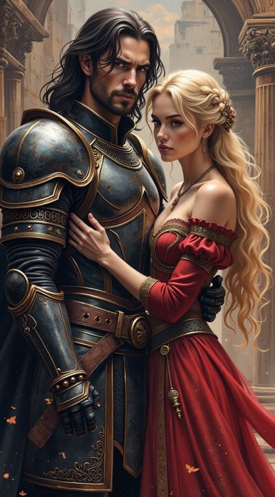 Мужчина — с длинными тёмными волосами, одет в изысканные тёмные доспехи с декоративными элементами. Его образ создаёт впечатление загадочности и силы, возможно, он принадлежит к аристократии или является воином магом., Женщина — с длинными светлыми волосами, одета в роскошное красное платье. Её поза и выражение лица передают смесь страсти и уязвимости, что подчёркивает драматизм сцены., Фон:, Архитектурные элементы в готическом стиле (арки, шпили) и мерцающие огни создают атмосферу мистического города или замка., Цветовая гамма контрастирует между холодными (синие, серые) и тёплыми (красные, золотые) оттенками, подчёркивая противостояние или связь между персонажами.