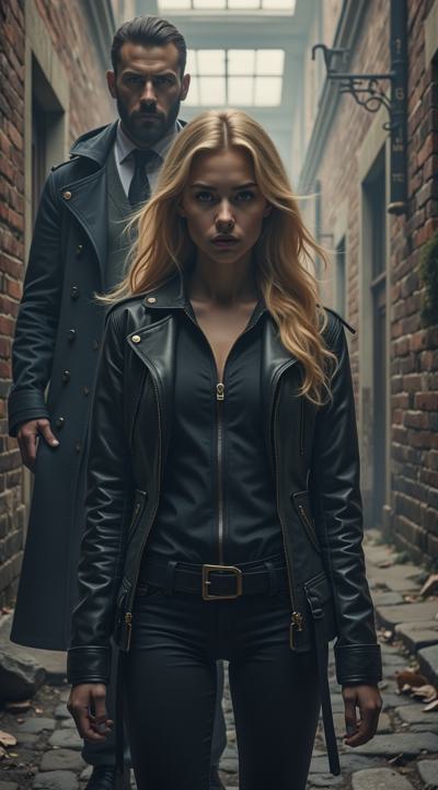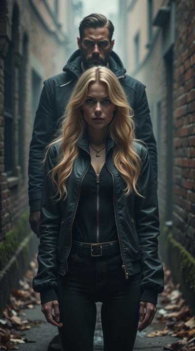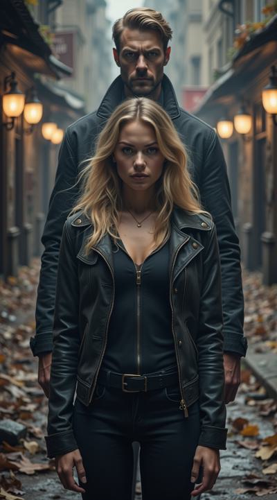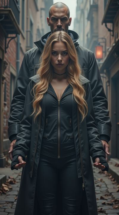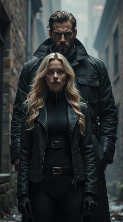 нарисуй обложку к Дарк роману про красивую молодую женщину, 25 с длинными светлыми волосами в костюме чёрного цвета леггинсы и кофта на молнии. попаданку в параллельный мир, к ней подходит стоит за спиной красивый мужчина повелитель тьмы образ. 30 брюнет в чёрном пальто, злой и жестокий держит её за руку не отпуская. вокруг параллельный мир. фотореализм, высокое качество, HD. рендер.