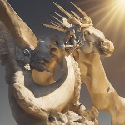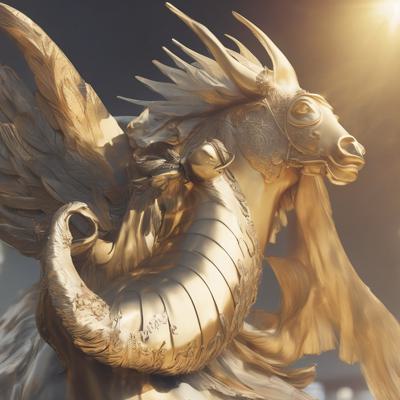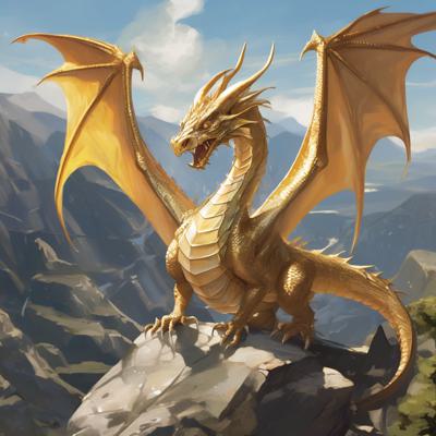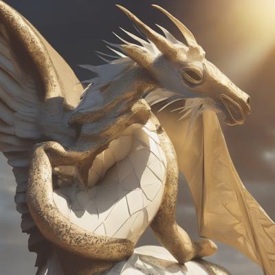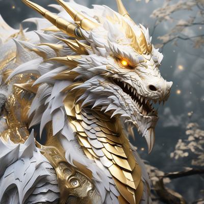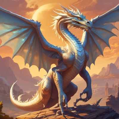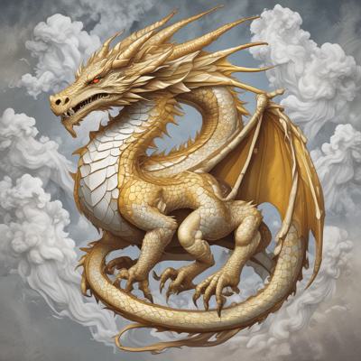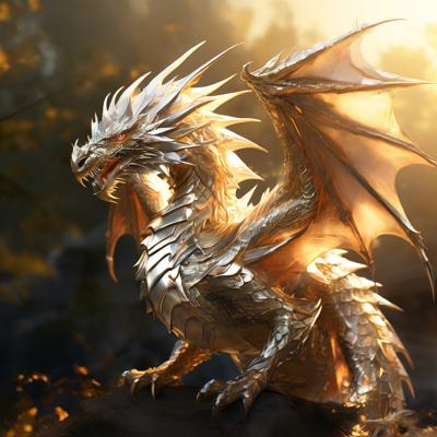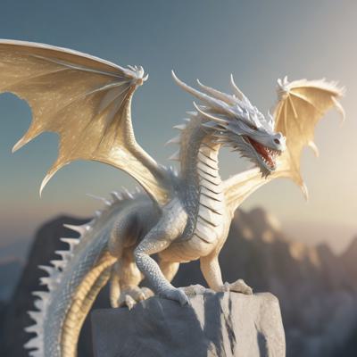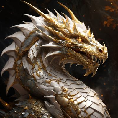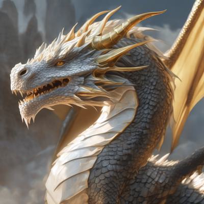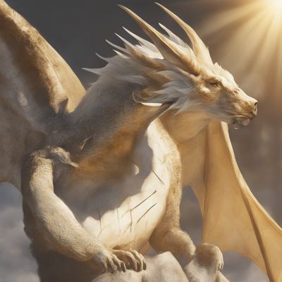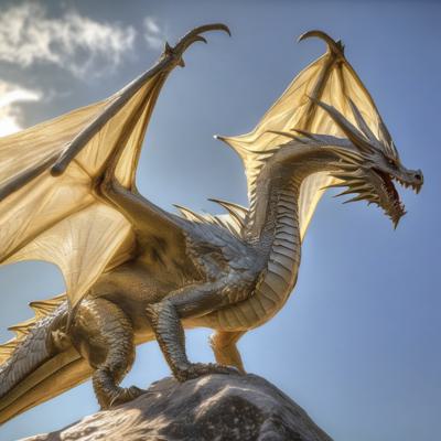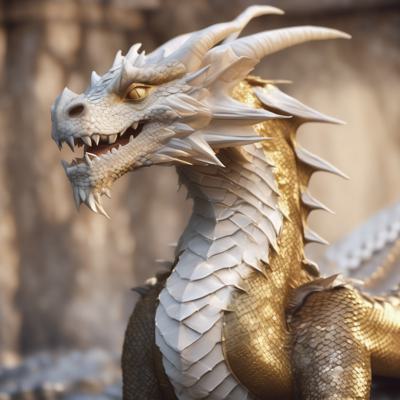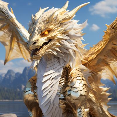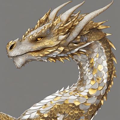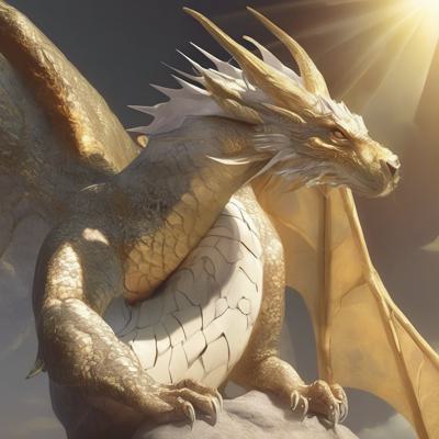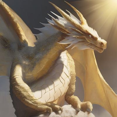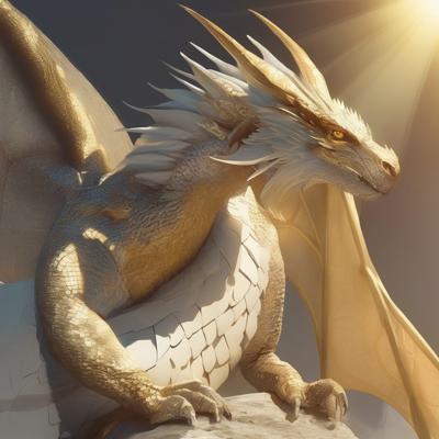 дракон с бело-золотой, переливающейся на солнце чешуей, перепончатыми крыльями и острым гребнем. [Вариации для #2331636 ]
